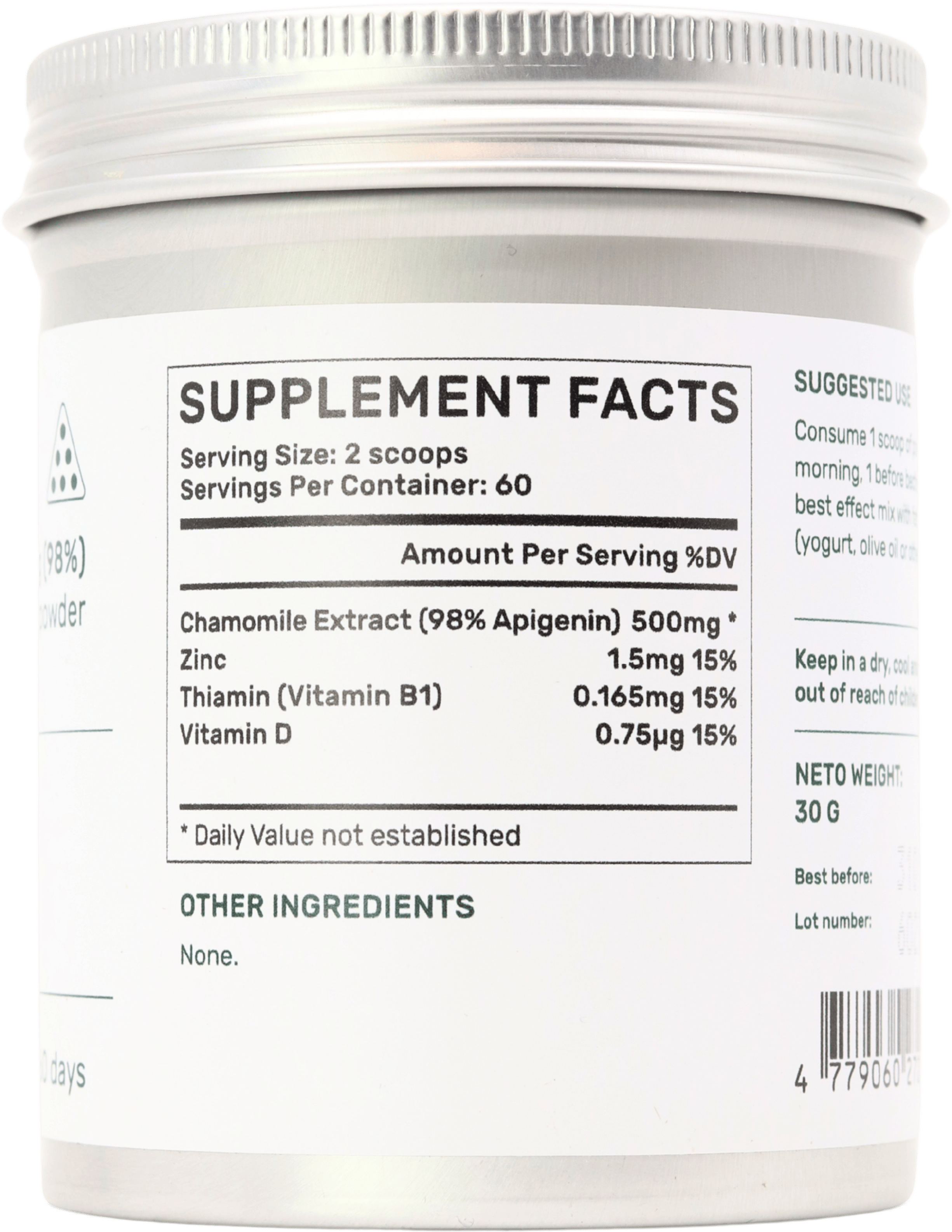 chamomile extract (of which at least 98% Apigenin), zinc, thiamin (Vitamin B1), vitamin D.