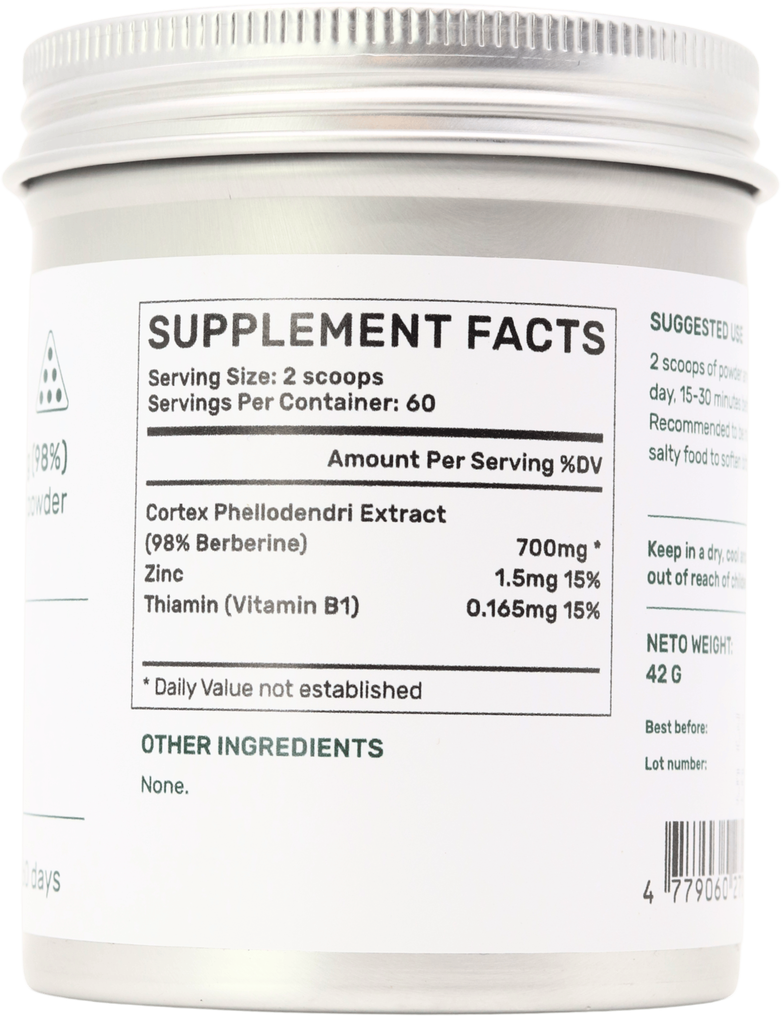 Amur Cork Tree extract (of which at least 98% Berberine), zinc, thiamin (Vitamin B1).