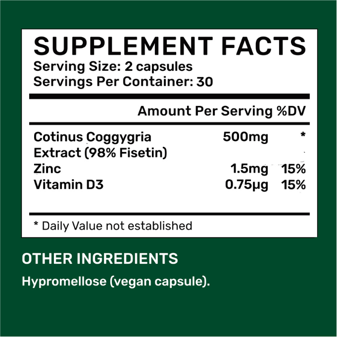 European Smoketree extract (of which at least 98% Fisetin), zinc, vitamin D, vegan HPMC capsule coating.