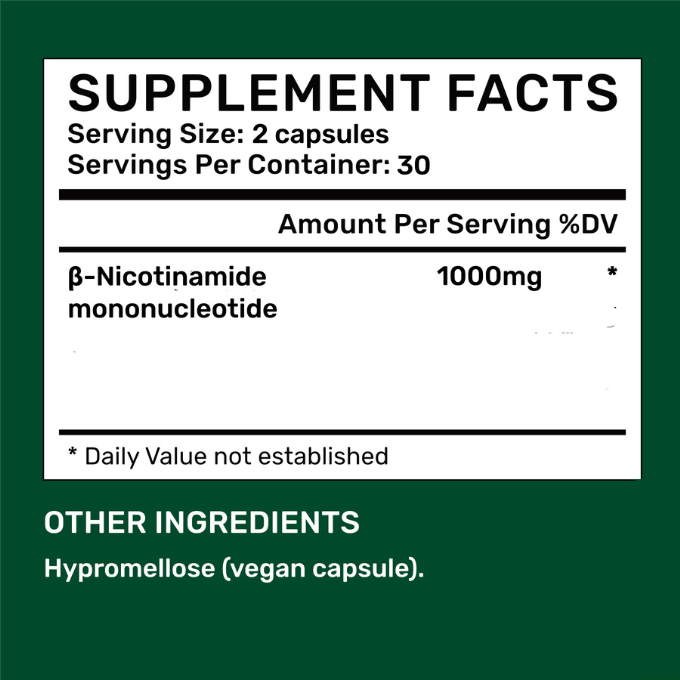 Beta Nicotinamide Mononucleotide (>99% purity), vegan HPMC capsule coating.