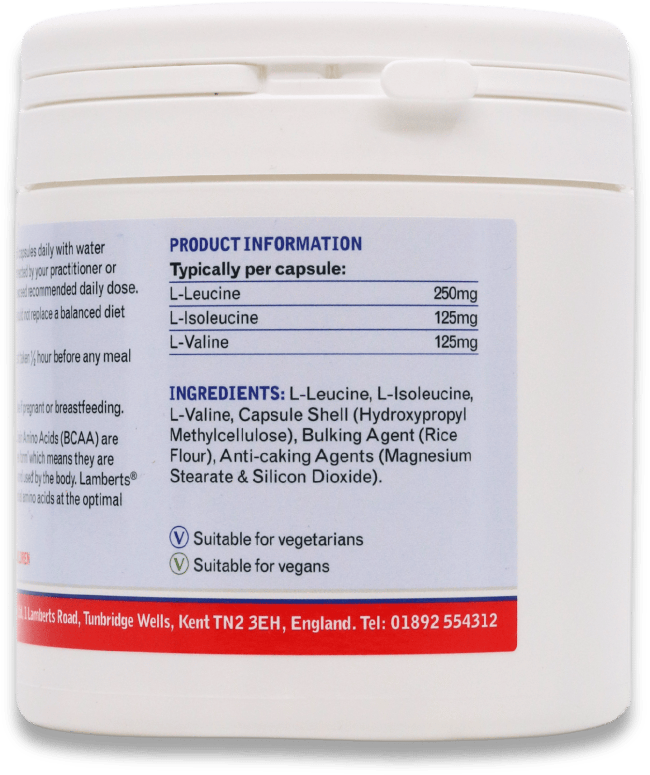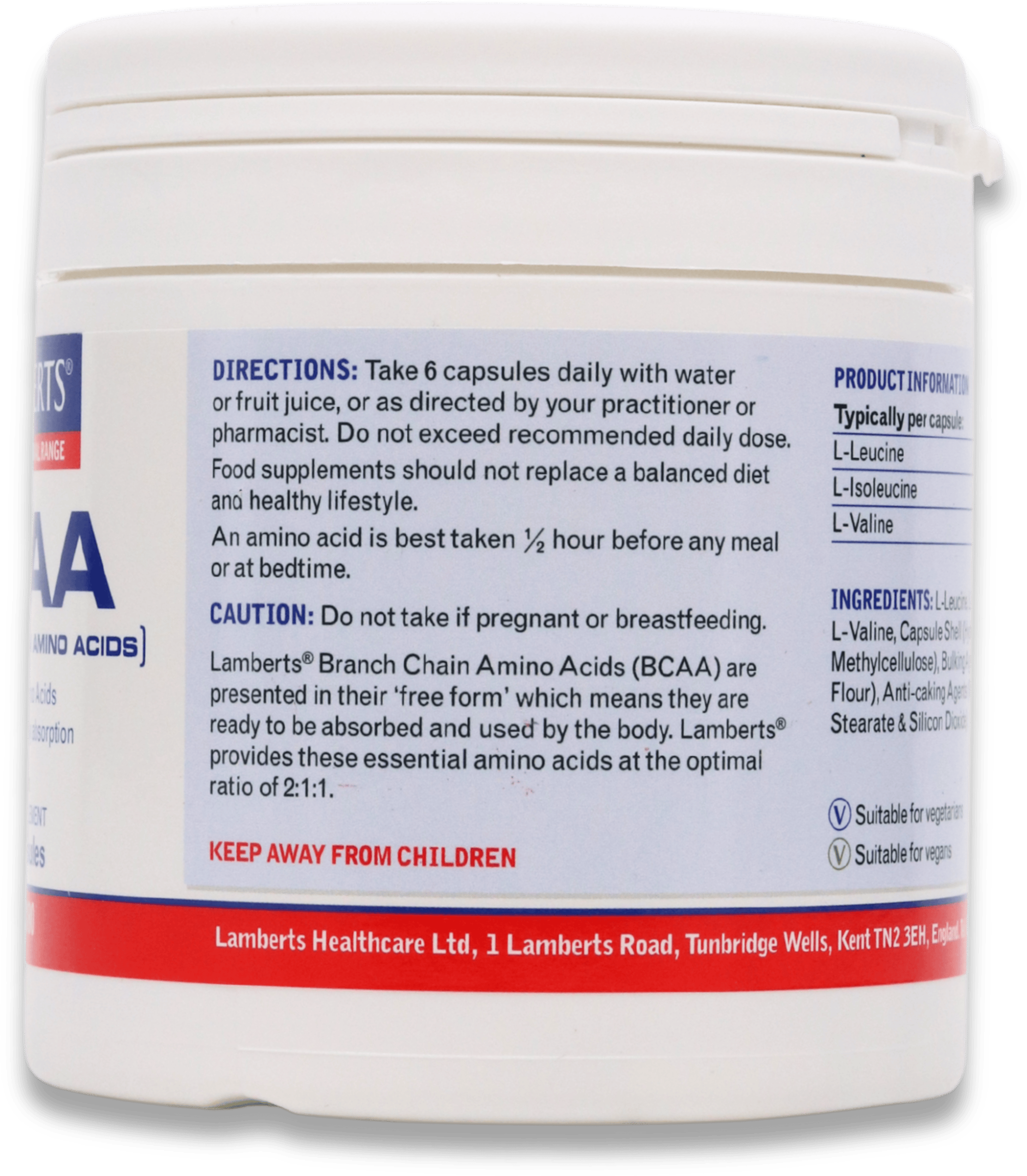 Lamberts BCAA (Branch Chain Amino Acids) 180 Capsules is designed for those aiming to support muscle repair, growth, and exercise recovery. Favoured by athletes and fitness enthusiasts, it features a scientifically supported 2:1:1 blend of L-Leucine, L-Isoleucine, and L-Valine. These essential amino acids are provided in their free form for quicker uptake by the body. Suitable for vegetarians and produced in the UK to pharmaceutical GMP standards, Lamberts BCAA is a practical option for supporting lean muscle and enhancing training recovery.