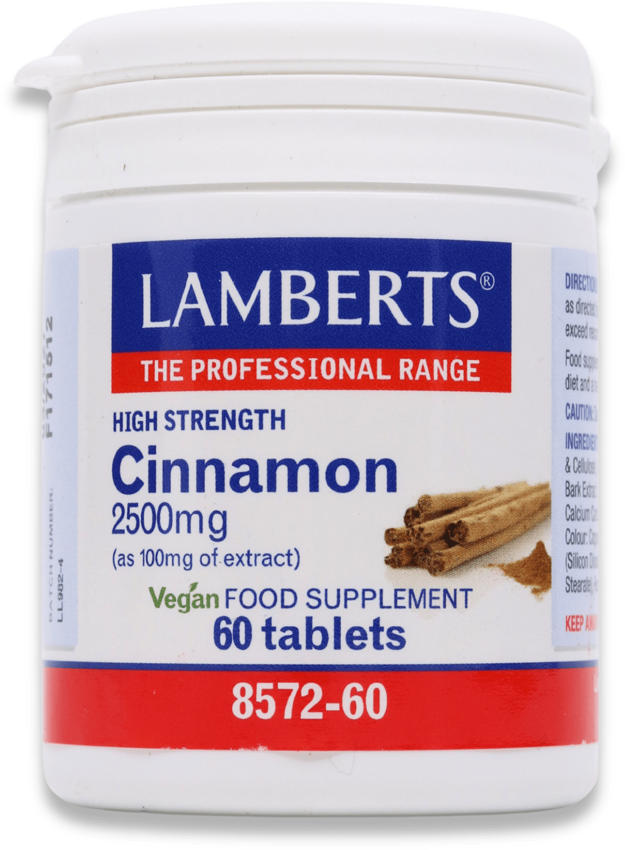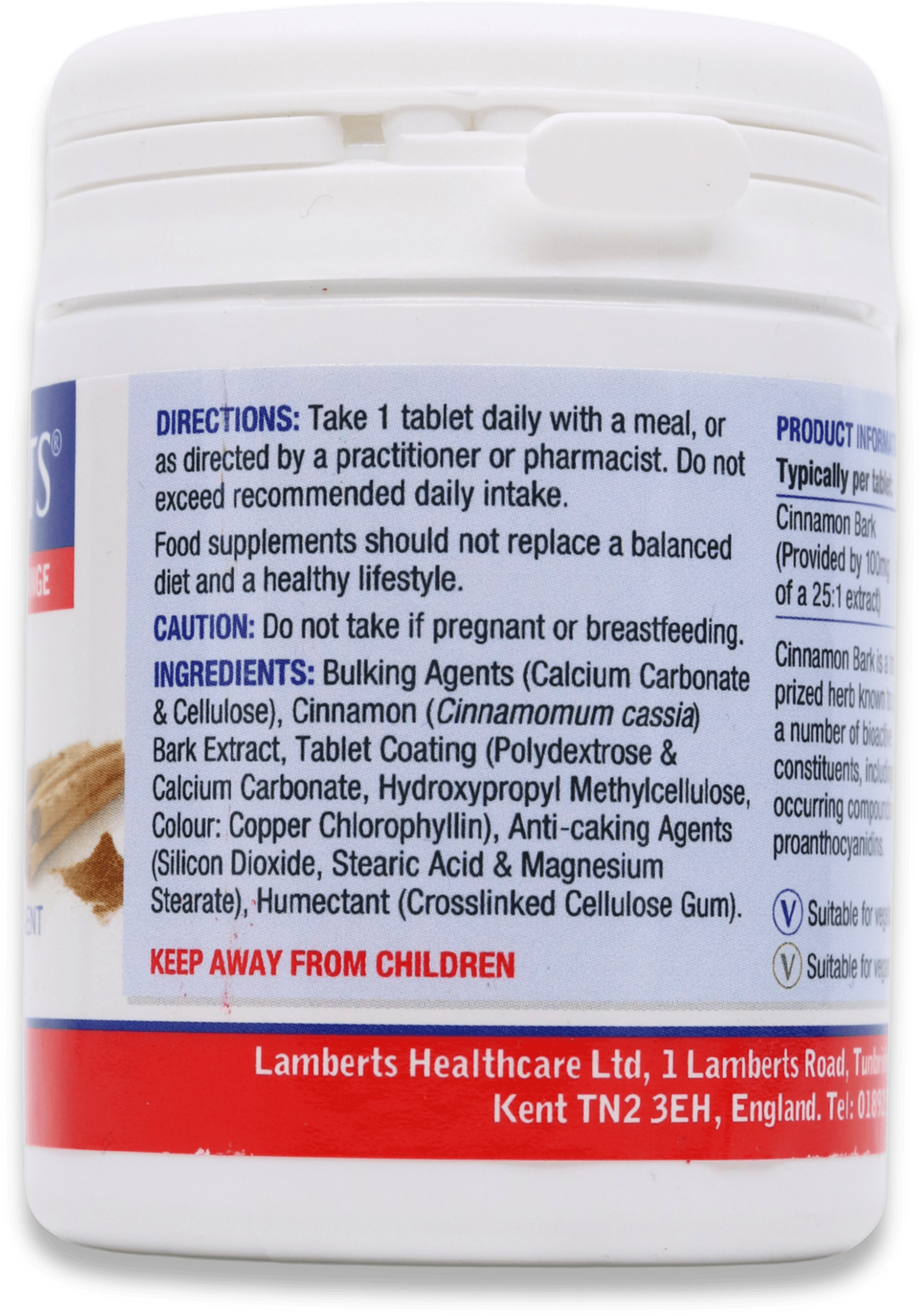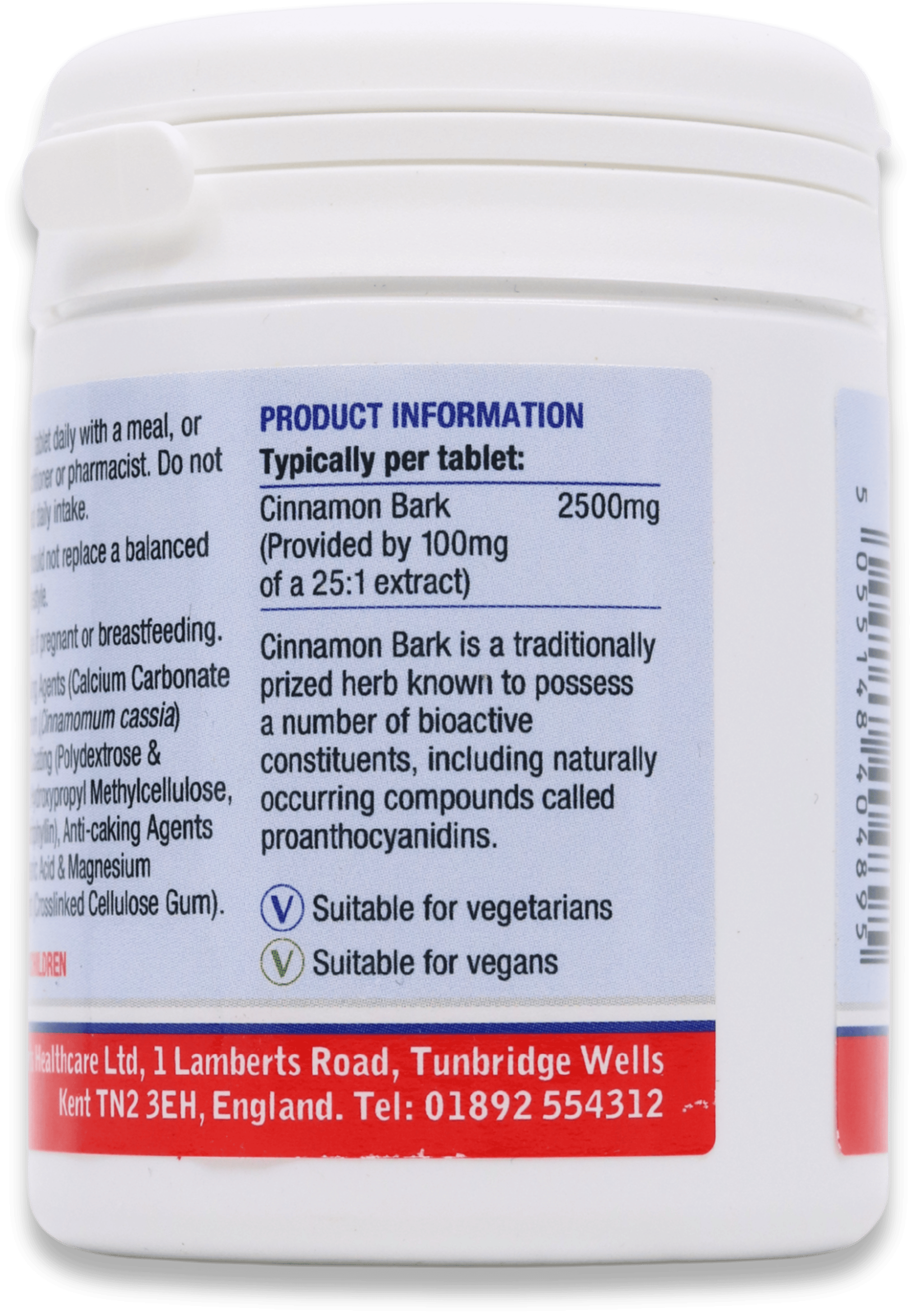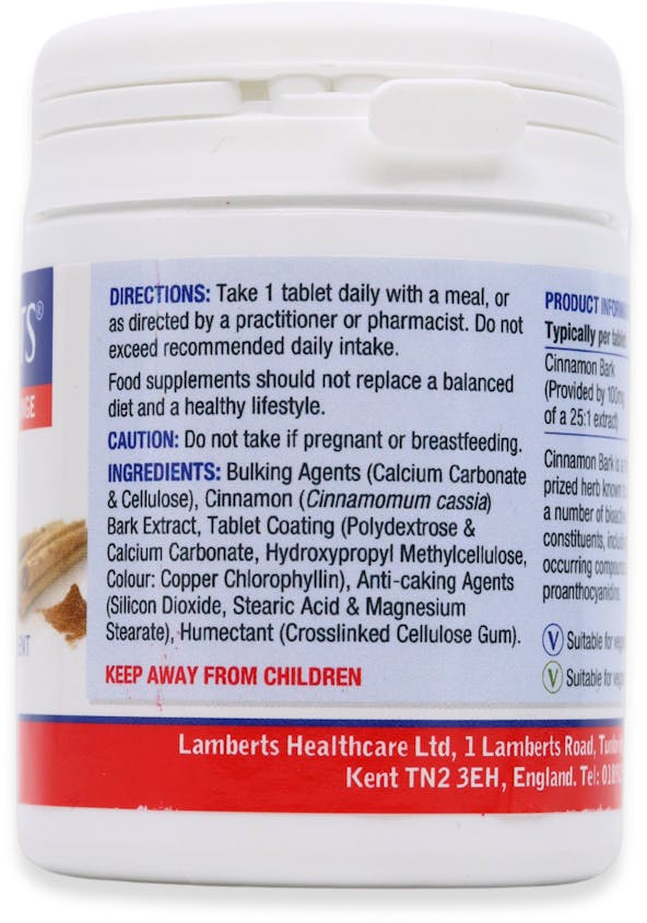 Lamberts Cinnamon 2500mg tablets are suitable for vegans and vegetarians, and are formulated, manufactured, and packed in the UK according to pharmaceutical GMP standards. Each bottle contains 60 easy-to-swallow, one-a-day tablets, offering a convenient daily supplement for maintaining balanced energy levels and supporting digestive health.
