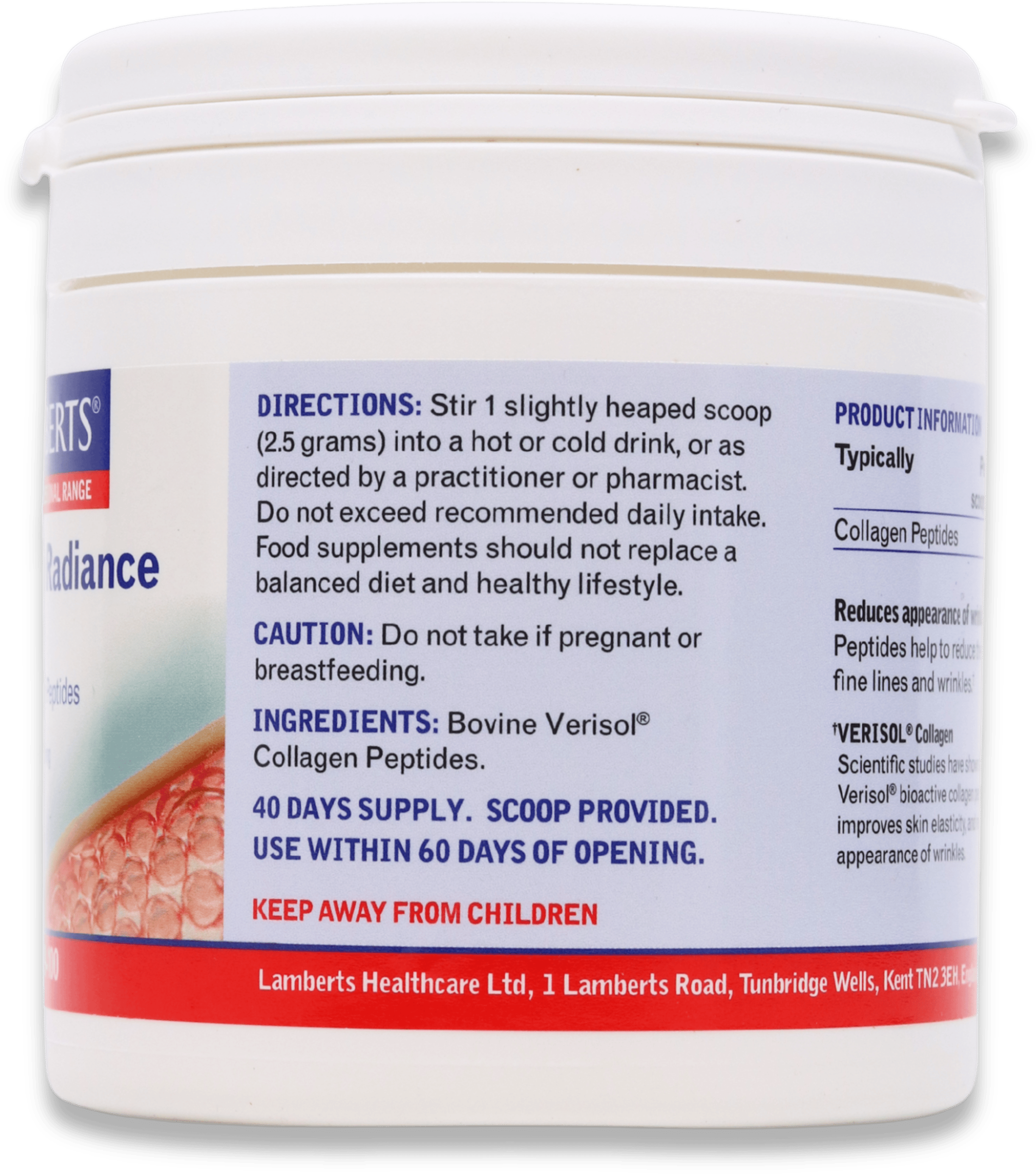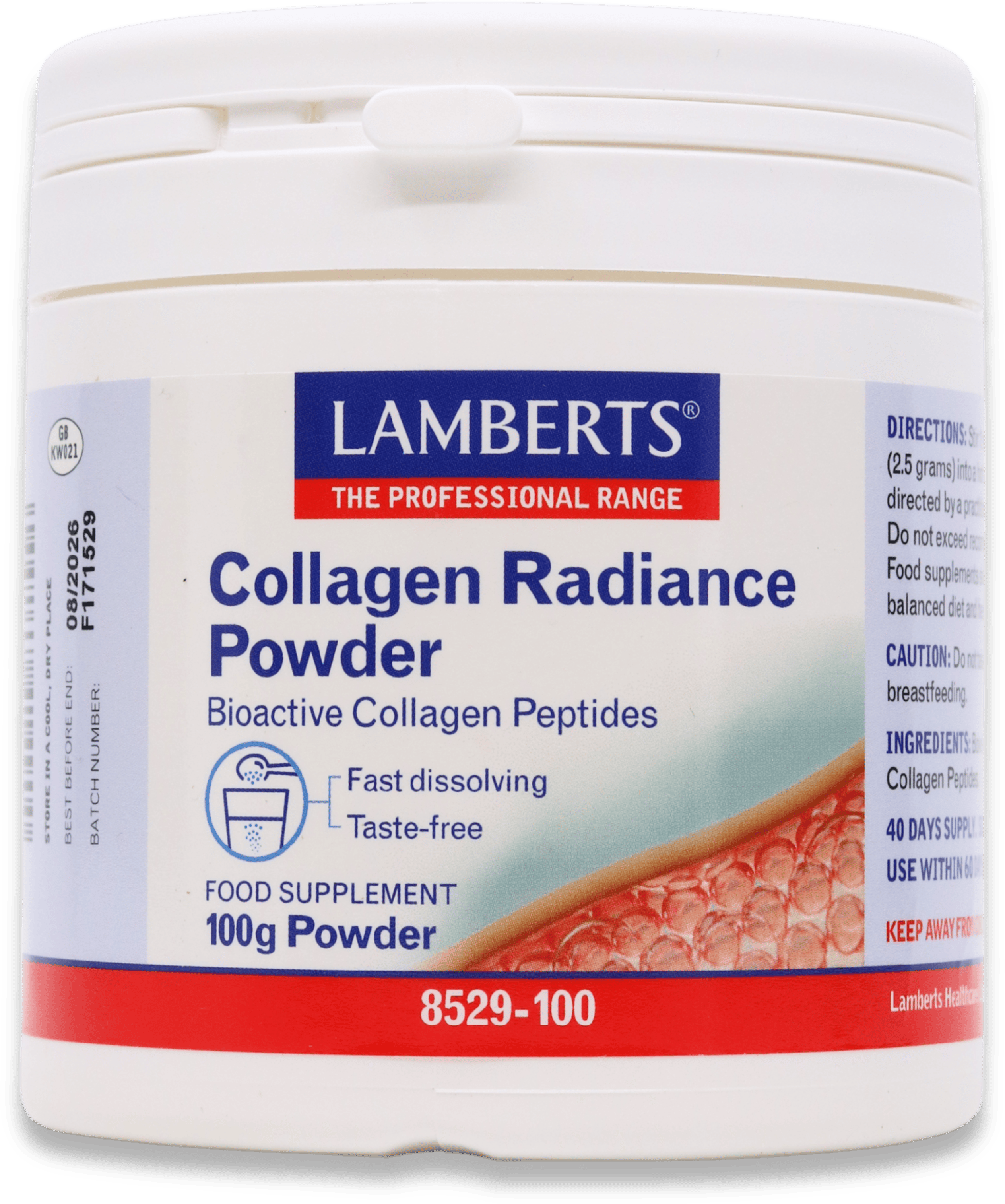 Lamberts Collagen Radiance Powder 100g is a high-quality supplement crafted to enhance skin health and maintain a youthful glow. The fast-dissolving, taste-free powder delivers 2500mg of Verisol® collagen peptides per serving, including bioactive type I and III collagen. Clinical research has shown that a daily intake of 2.5g of Verisol® collagen can improve skin elasticity and diminish the appearance of fine lines and wrinkles. Suitable for adults of all ages, this powder provides a convenient way to add collagen to a daily skincare regimen.
