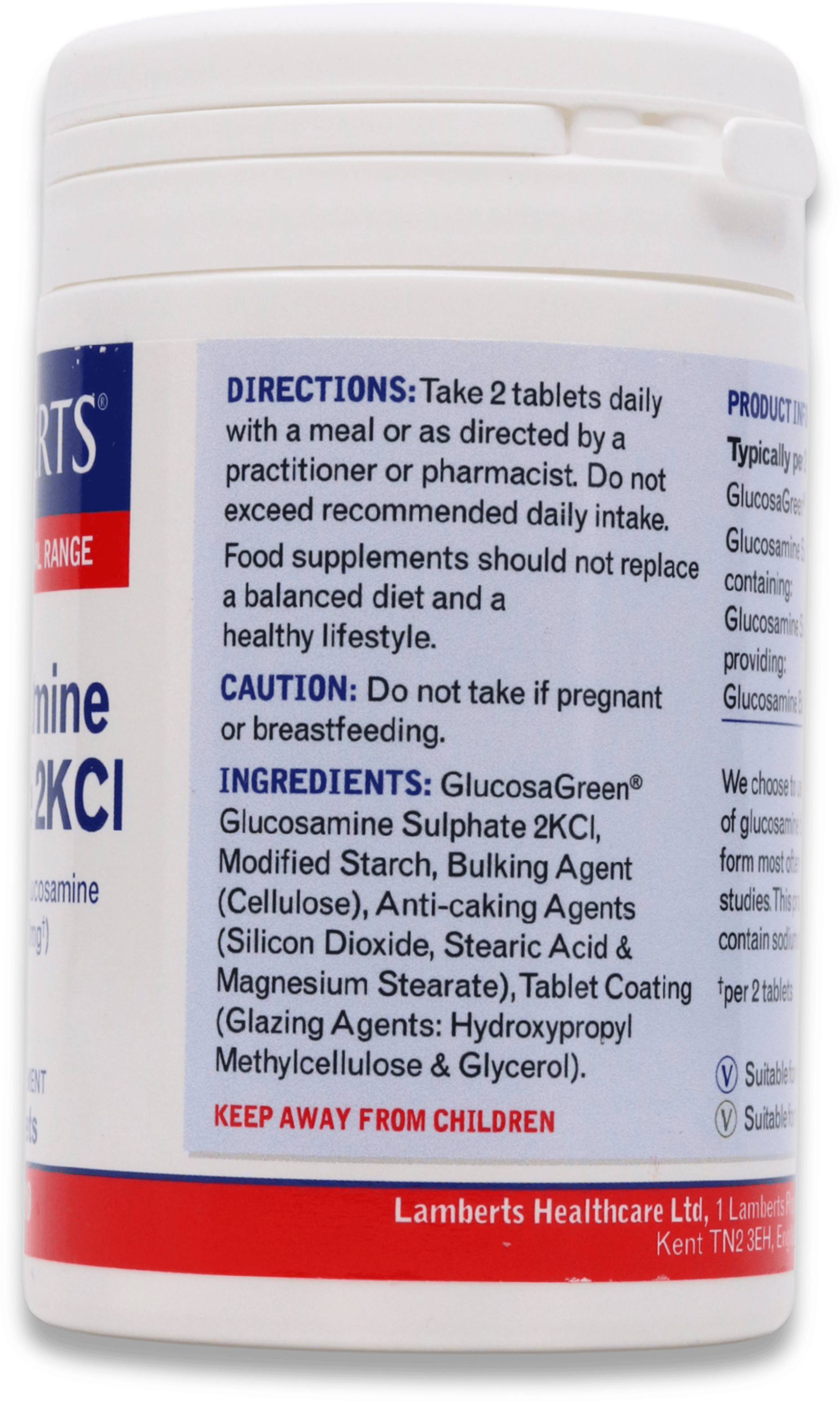 Lamberts Glucosamine Sulphate 2KCl 120 Tablets is a high-strength supplement created to support joint function and the upkeep of cartilage. Designed with active individuals and those experiencing age-related joint changes in mind, it's an excellent option for maintaining comfort and flexibility. Each tablet contains 700mg of glucosamine sulphate sourced from GlucosaGreen® – a vegan-friendly, shellfish-free alternative that’s bioequivalent to conventional glucosamine. Produced in the UK to stringent pharmaceutical GMP standards, Lamberts Glucosamine Sulphate 2KCl is widely used by professionals for its reliability and consistent formulation. With taste-free, coated tablets, it's a convenient addition to any daily routine.