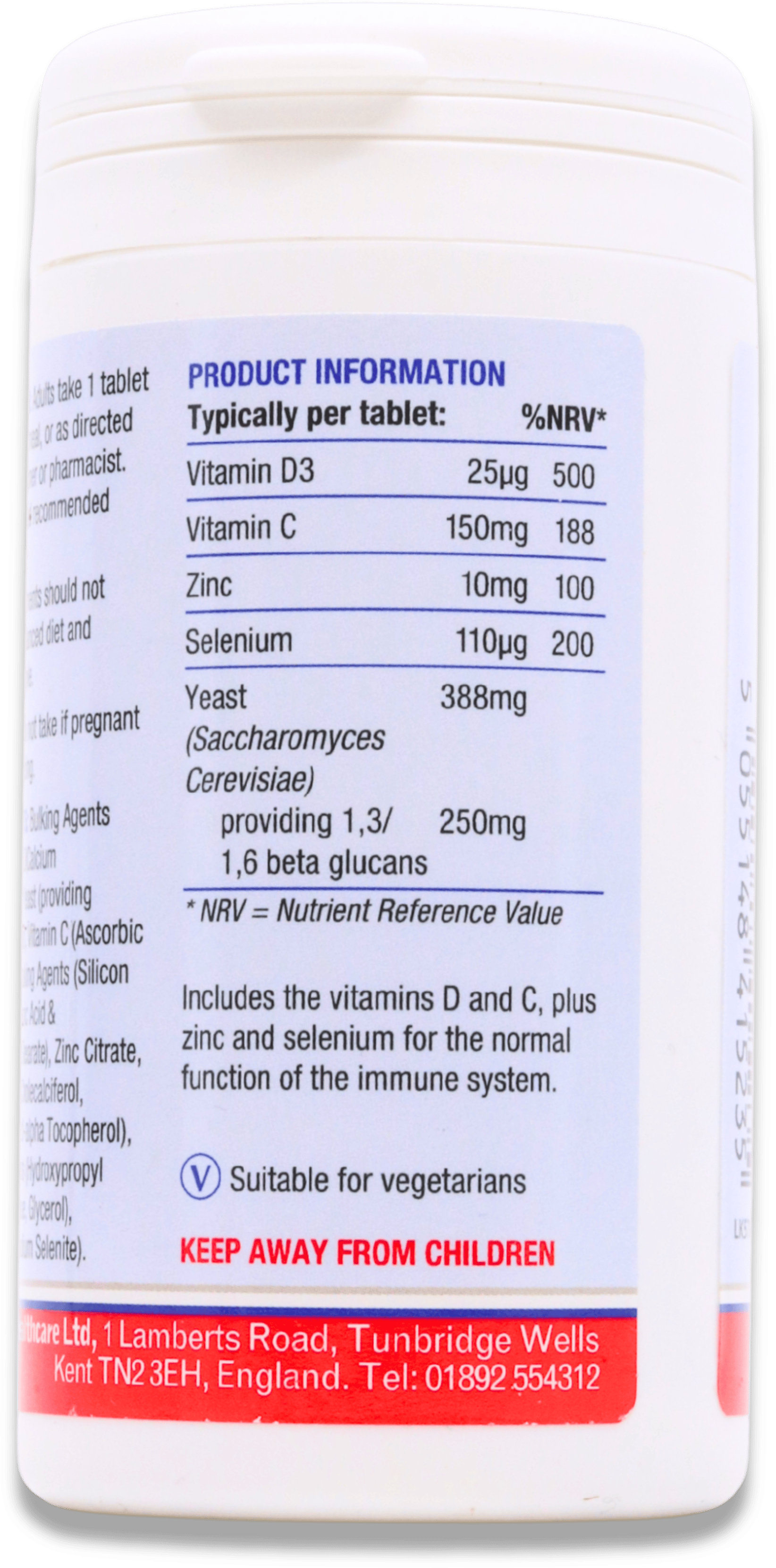 Each tablet delivers: Vitamin D3 (1000iu) 25µg Vitamin C 150mg Zinc (as citrate) 10mg Selenium (as selenite) 110µg Yeast (Saccharomyces Cerevisiae) 388mg providing 1,3/ 1,6 beta glucans 250mg