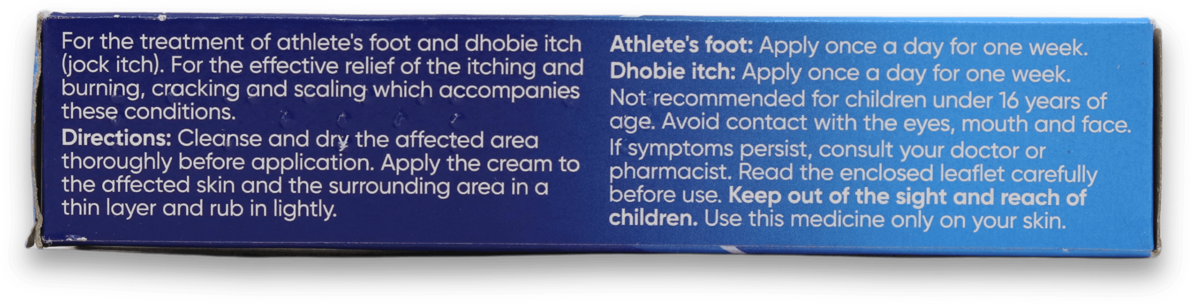For athlete's foot and dhobie itch, apply the cream once a day for one week. Cleanse and dry the affected areas thoroughly before applying the cream in a thin layer, and gently rub it in. If used between the toes, buttocks or on the groin, the treated area may be covered with a light, fresh gauze strip, especially at night. Wash your hands and replace the cap on the tube after use.