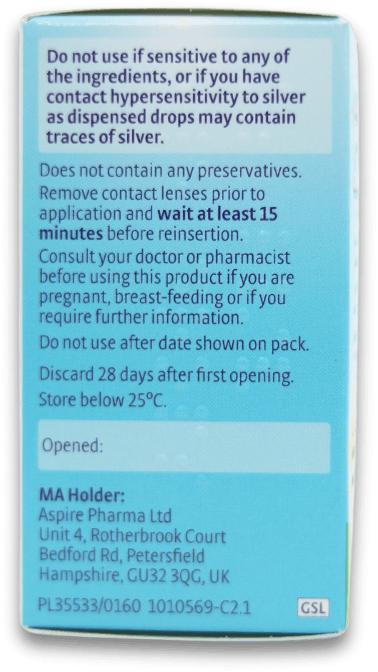 Do not use if sensitive to any of the ingredients, or if you have contact hypersensitivity to silver as dispensed drops may contain traces of silver. Does not contain any preservatives. Remove contact lenses prior to application and wait at least 15 minutes before reinsertion. Consult your doctor or pharmacist before using this product if you are pregnant, breast-feeding or if you require further information.