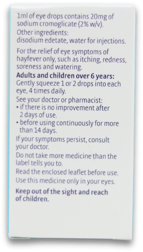 1ml of eye drops contains 20mg of sodium cromoglicate (2% w/v).