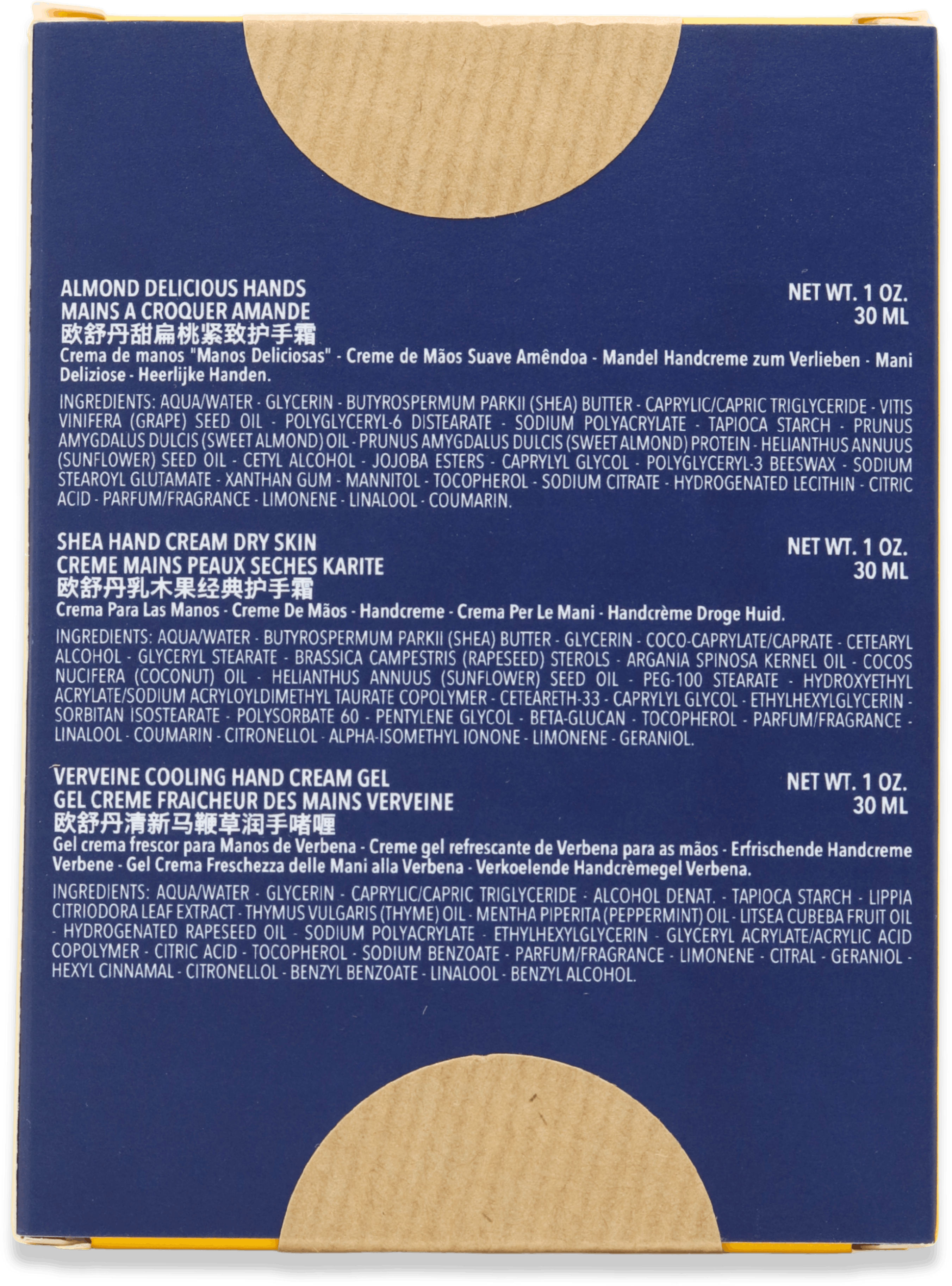 Each set contains Almond Delicious Hands Cream 30 ml, Shea Hand Cream 30 ml, and Verbena Cooling Hand Cream Gel 30 ml. Almond delivers a sweet, comforting scent with nourishing almond oil. Shea Hand Cream focuses on intensive care with a high shea butter content for very dry hands. Verbena Cooling Hand Cream Gel has a lighter gel cream texture with a fresh citrus scent.