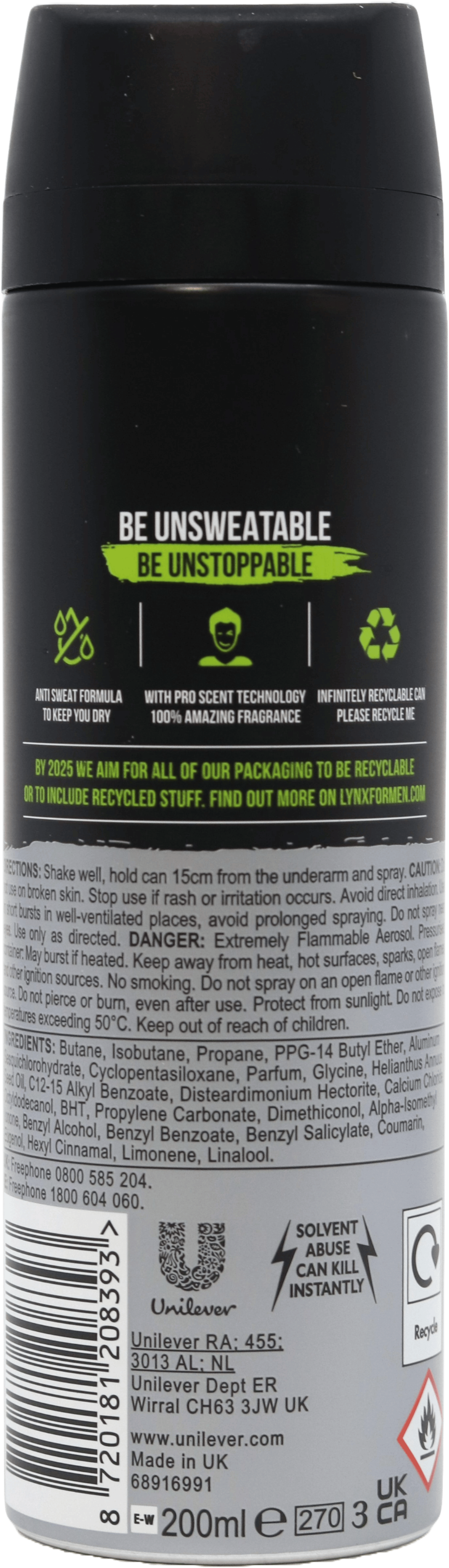 Meet Lynx Epic Fresh Anti-Perspirant Deo 200ml! It's like a superhero spray for your armpits. This spray stops you from getting sweaty and smelly for up to 3 whole days. Plus, it smells like yummy grapefruit and pineapple, so you'll smell super cool all day long.