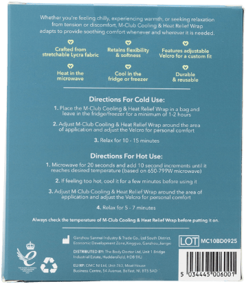 M-Club Cooling & Heat Relief Wrap offers dual-temperature therapy designed for menopause discomfort, muscle tension, and joint pain. This adaptable wrap delivers either soothing warmth or refreshing coolness to the head, face, neck, shoulders, or any affected area. Crafted from soft, flexible Lycra fabric with an adjustable Velcro strap, it provides a custom, comfortable fit whilst addressing hot flushes, period pain, headaches, migraines, and everyday soreness.