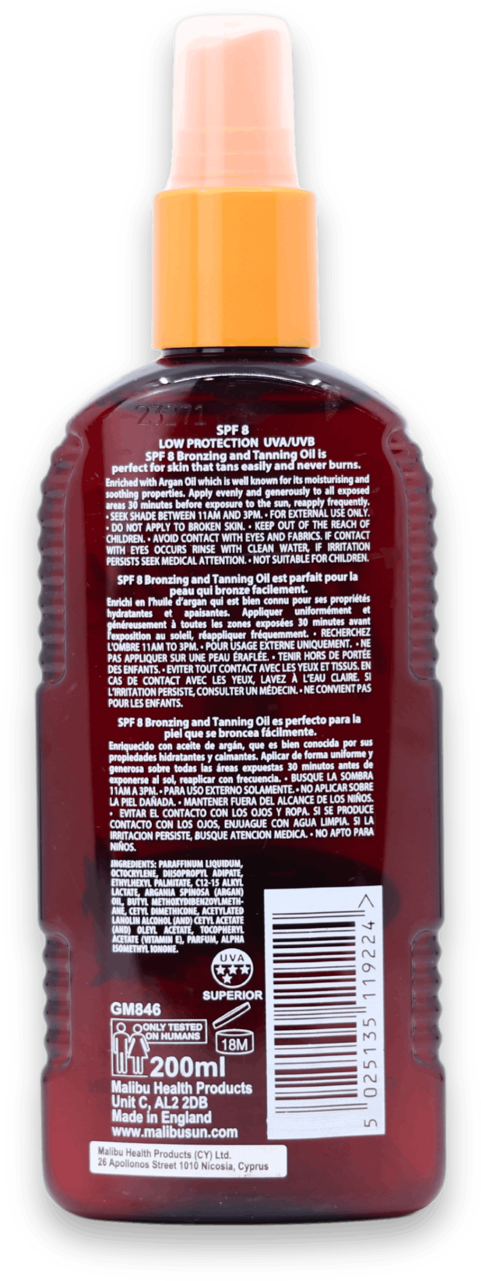 Malibu Bronzing Tan Oil SPF8 200ml is designed primarily for body use.