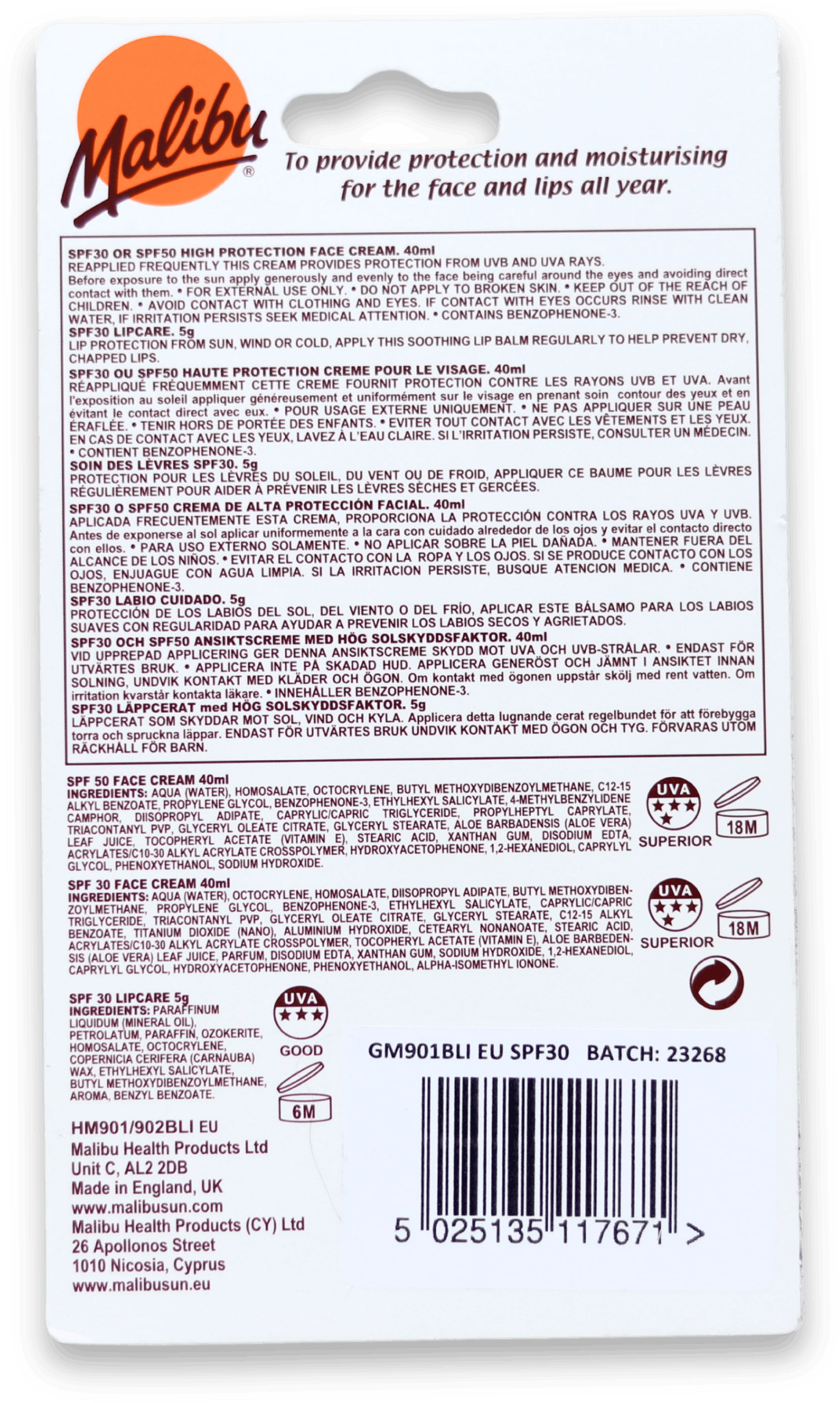 Malibu Face Cream SPF30 40ml & Lip Balm SPF30