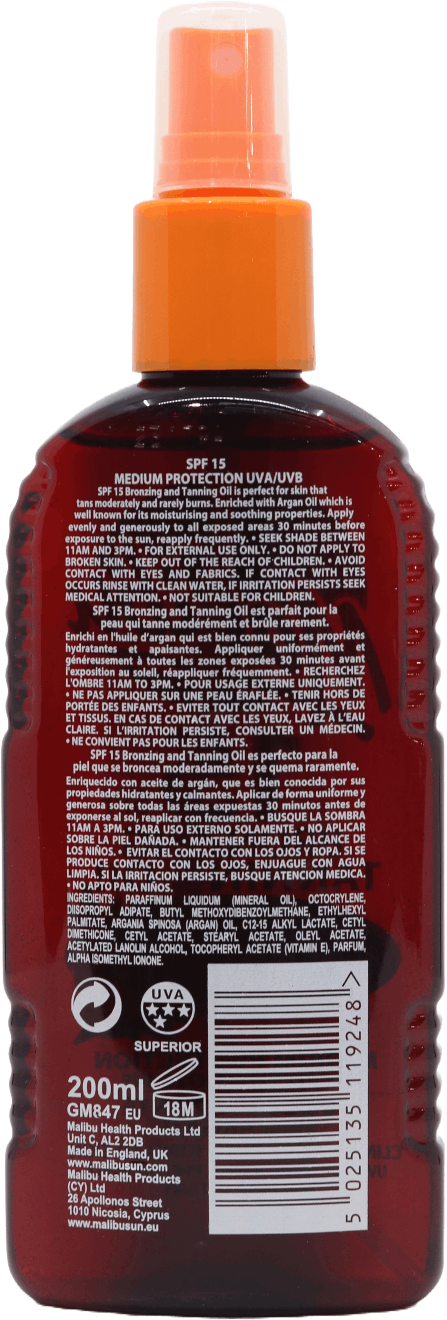 Malibu Tanning Oil Argan SPF15 offers several benefits to those seeking a bronzed glow. The fast tanning formula contains argan oil, which not only gives your skin a tropical scent but also enriches and moisturizes it. In addition, the medium SP factor 15 provides protection against harmful UV rays, and the water-resistant formula allows for worry-free swimming and towel drying. The easy-to-use spray bottle ensures full coverage, making the application process straightforward and hassle-free. Malibu sun care products are suitable for all skin types and are kind to the skin as they are cruelty-free.