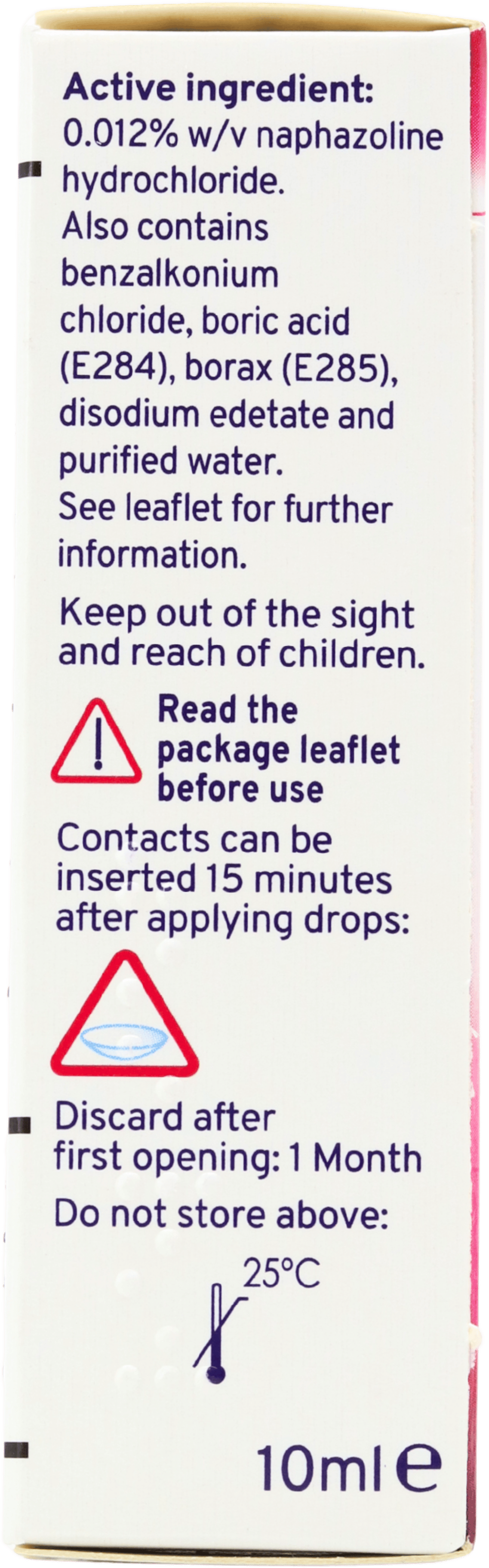 Active ingredients: 0.012% w/v Naphazoline Hydrochloride.