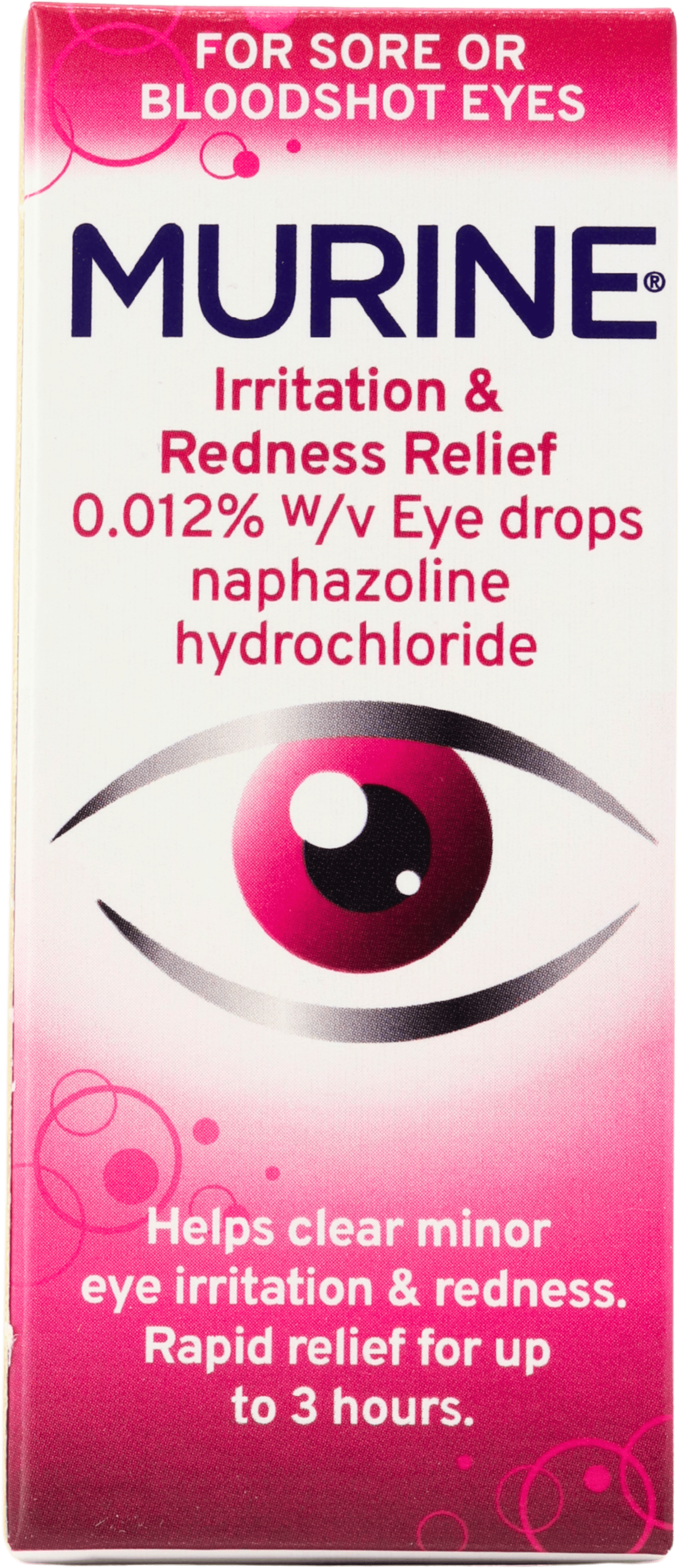 The active ingredient in Murine Irritation and Redness Eye Drops is Naphazoline Hydrochloride and it works by constricting the blood vessels in the eyes, reducing redness and irritation.