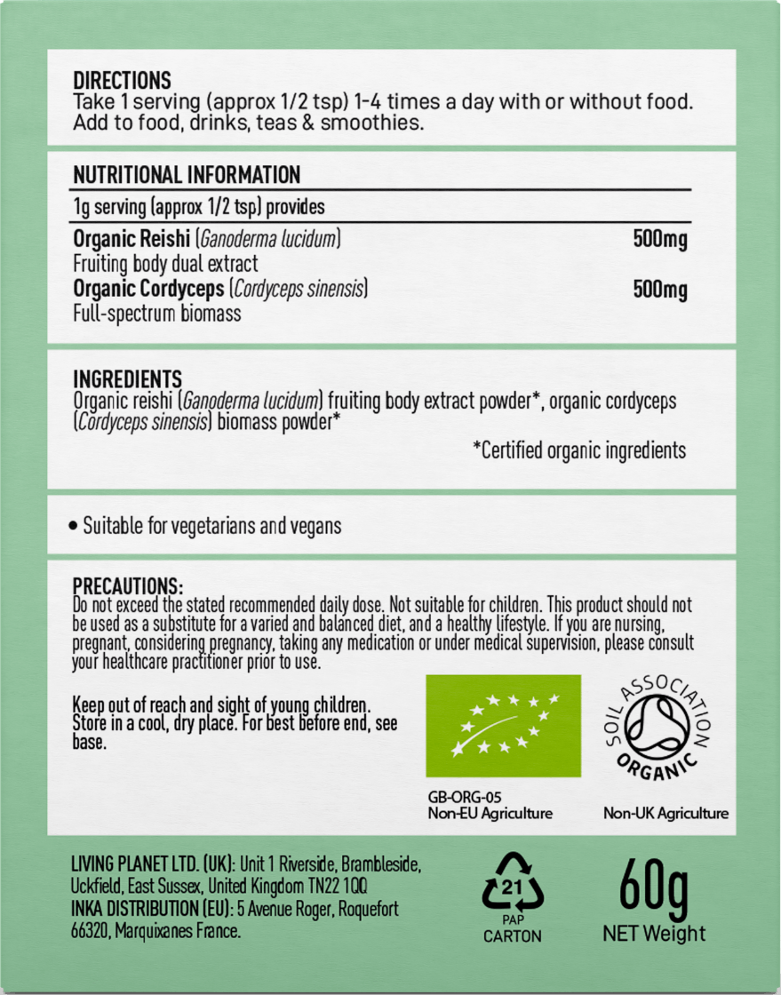 Contains: Organic reishi (Ganoderma lucidum) fruiting body extract powder, organic cordyceps (Cordyceps sinensis) biomass powder.