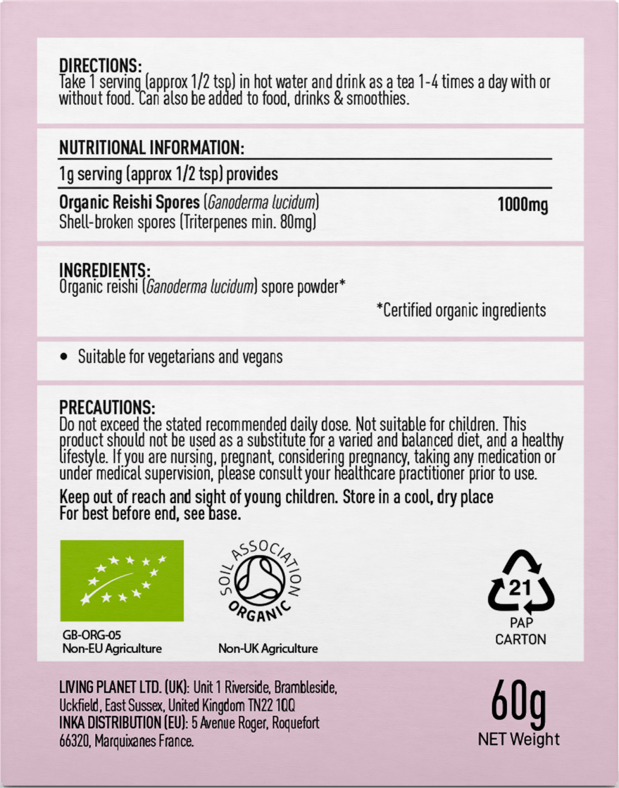- Packed with organic Reishi spores (Ganodema lucidum), rich in active triterpenes and polysaccharides.
