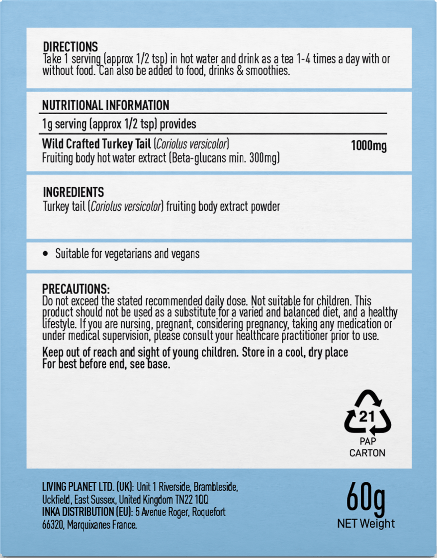 - Mushrooms 4 Life Organic Turkey Tail Powder Amber Glass 60g is an organic food supplement in powder form