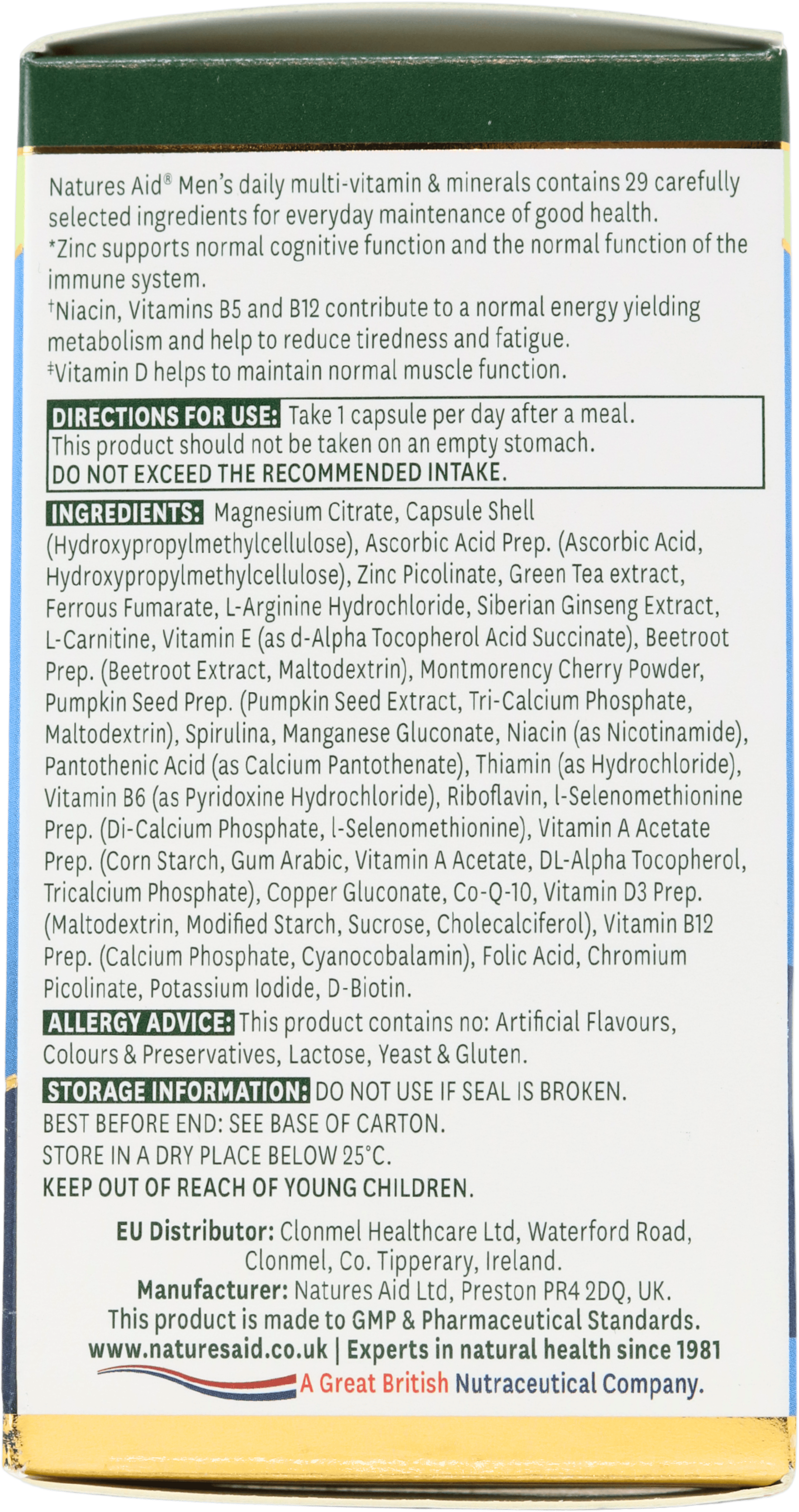 atures Aid Men’s daily multi-vitamin & minerals contains 29 carefully selected ingredients for everyday maintenance of good health. Including: