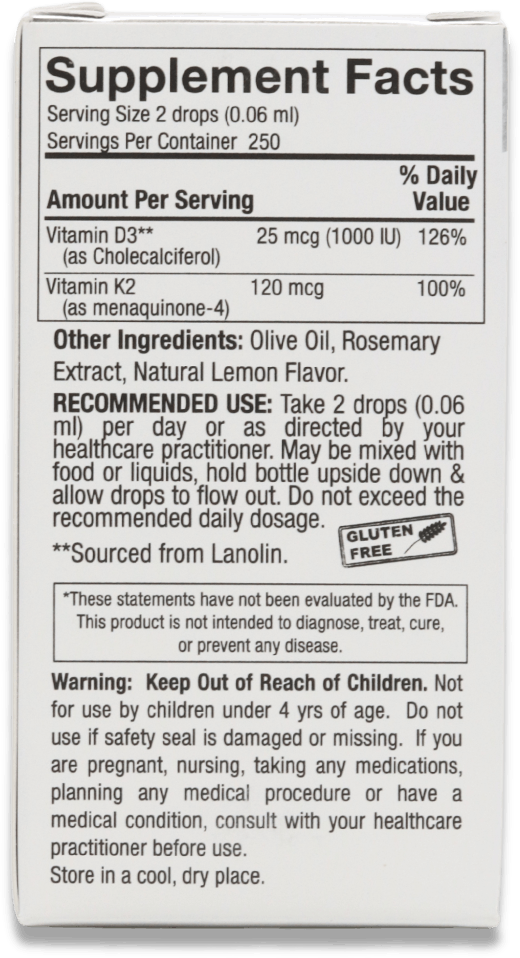 Vitamin D3 (as Cholecalciferol) (sourced from lanolin), Vitamin K2 (as menaquinone-4)