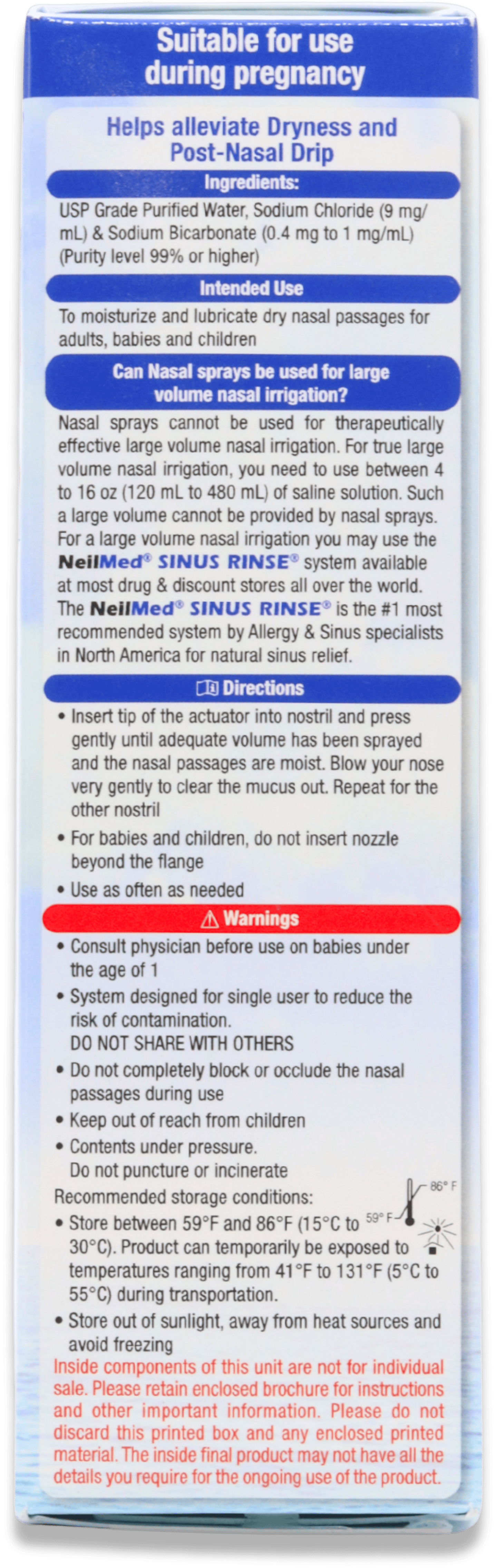 To moisturise and lubricate dry nasal passages, insert the nozzle into each nostril and press gently until solution has been sprayed and you can breath easy again. Use as often as needed.