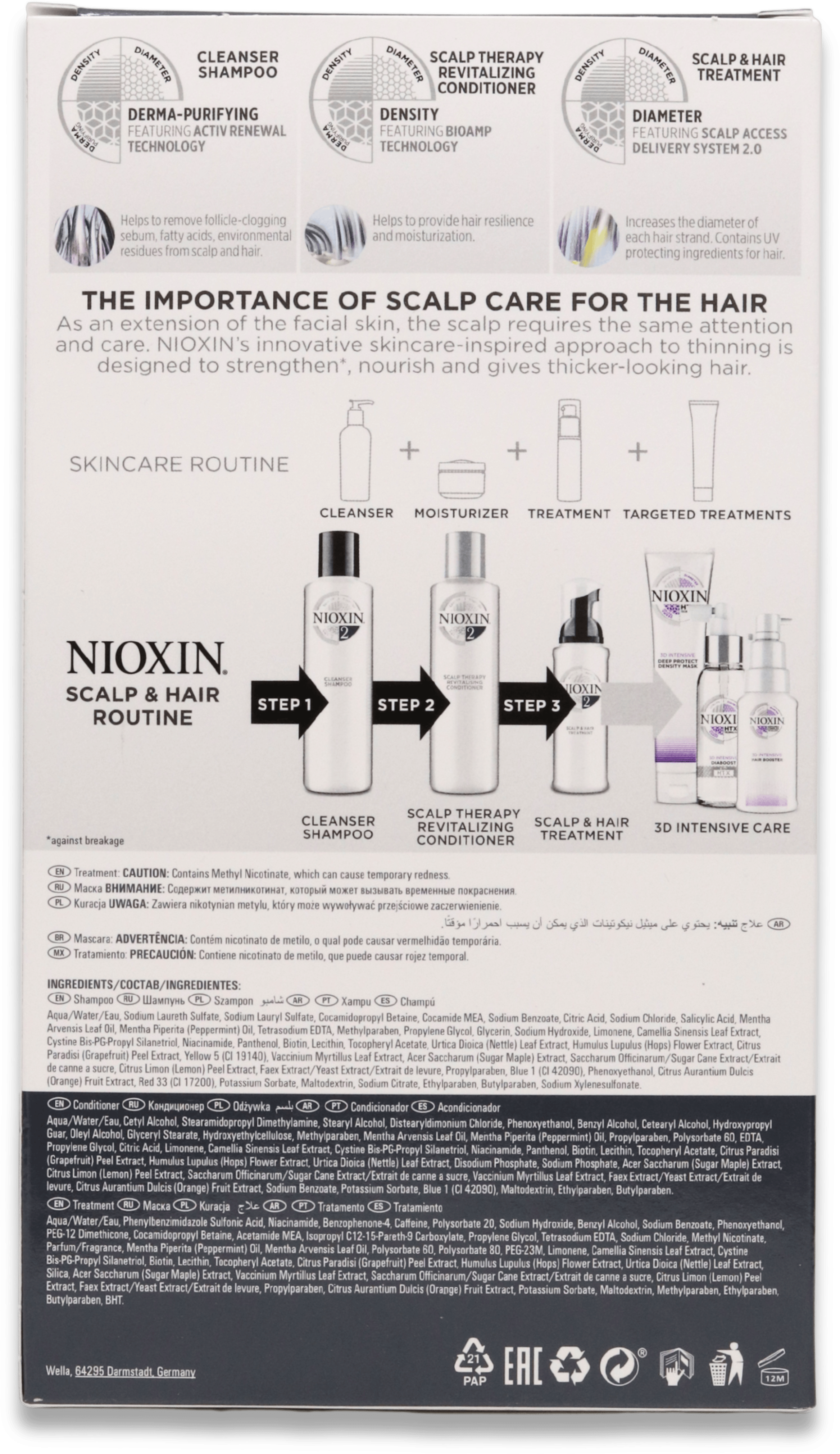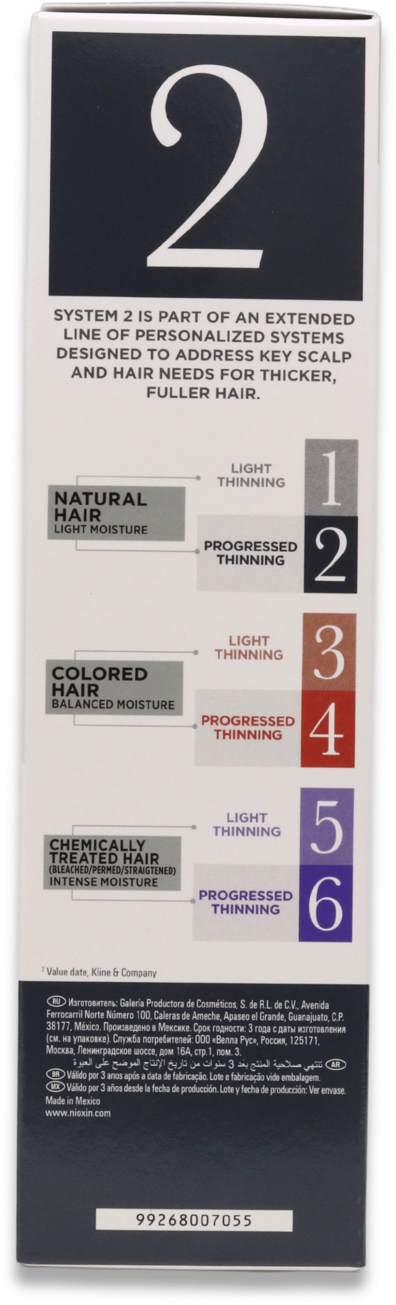 Nioxin System 2 supports thicker-looking hair in individuals with progressed thinning. It helps reduce breakage, enhances scalp health, and makes hair appear denser through targeted root nourishment and removal of build-up.