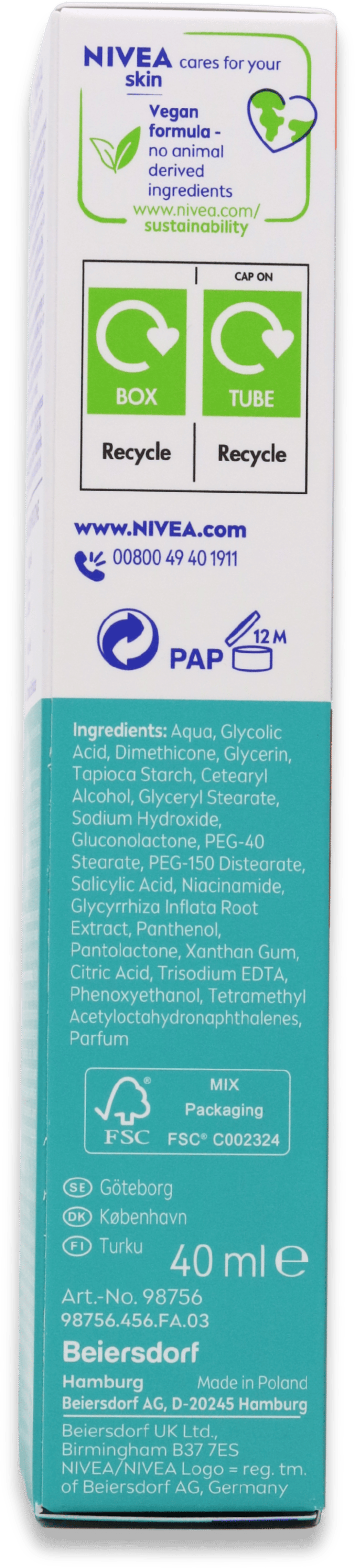 The Nivea Derma Skin Clear Exfoliator offers a gentle yet effective solution for those with blemish-prone skin. This vegan-friendly formula features a blend of 8% salicylic acid, glycolic acid, and niacinamide, designed to reduce the appearance of blemishes and prevent new ones from forming. Clinically tested, this exfoliator enhances skin appearance within 7 days, supporting the skin's renewal process and refining texture. With antibacterial properties, it is particularly suitable for individuals dealing with acne and oily skin.
