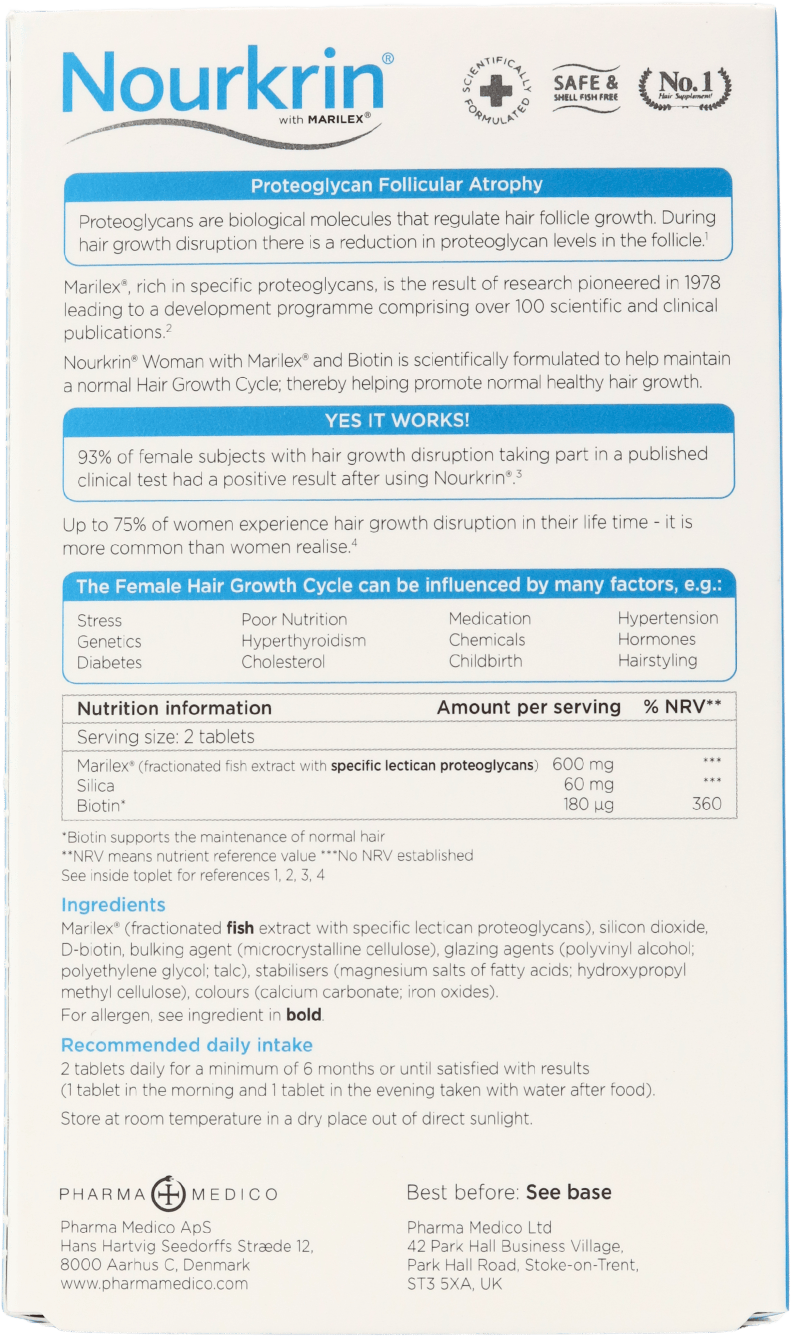 Marilex (fractionated fish extract with specific lectican proteoglycans), silicon dioxide, fenugreek (trigonella foenum-graecum), ascorbic acid, D-biotin, bulking agent (microcrystalline cellulose), stabiliser (hydroxypropyl methyl cellulose: magnesium salts of fatty acids), glazing agents (glycerol; talc), colours (iron oxides; titanium dioxide).