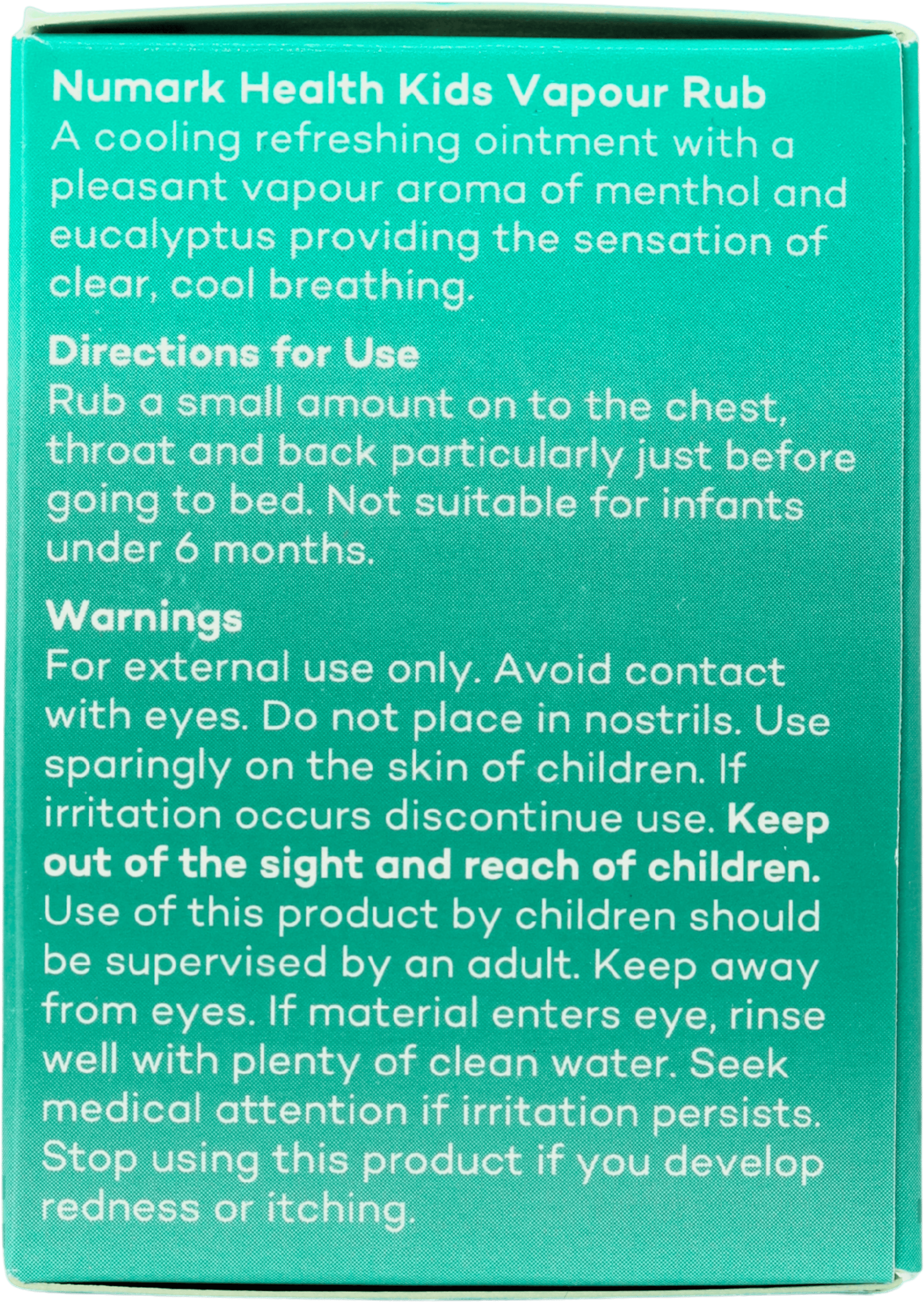 Numark Child Vapour Rub is suitable for infants over the age of 6 months. It should be used sparingly and under adult supervision.