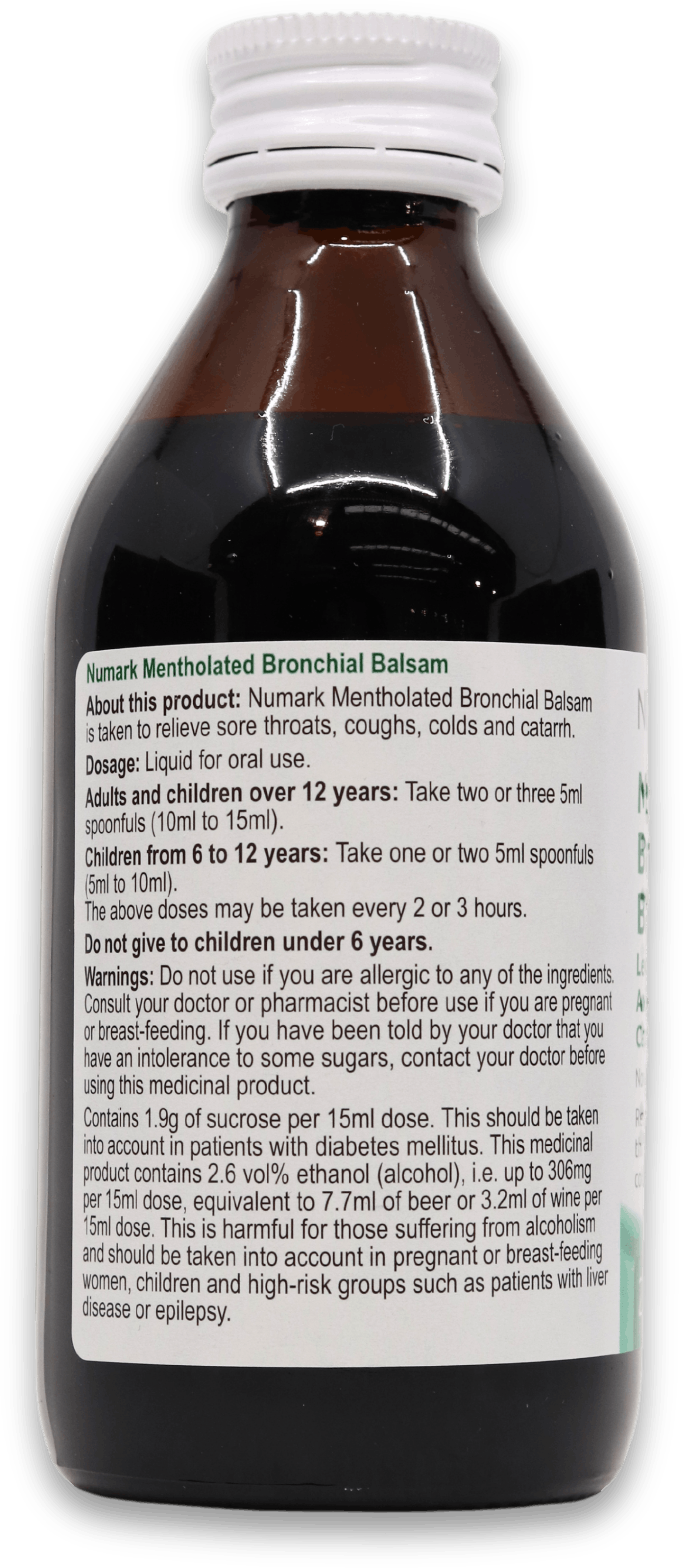 Diabetics should note this product contains 1.9g of sucrose per 15ml dose. Numark Mentholated Bronchial Balsam has 2.6 vol% ethanol (alcohol), i.e. up to 306mg per 15ml dose, equivalent to 7.7ml of beer or 3.2ml of wine per 15ml dose. This may be harmful to those suffering from alcoholism. Please also take this into account if you are pregnant or breastfeeding, children and high-risk groups such as patients with liver disease or epilepsy.