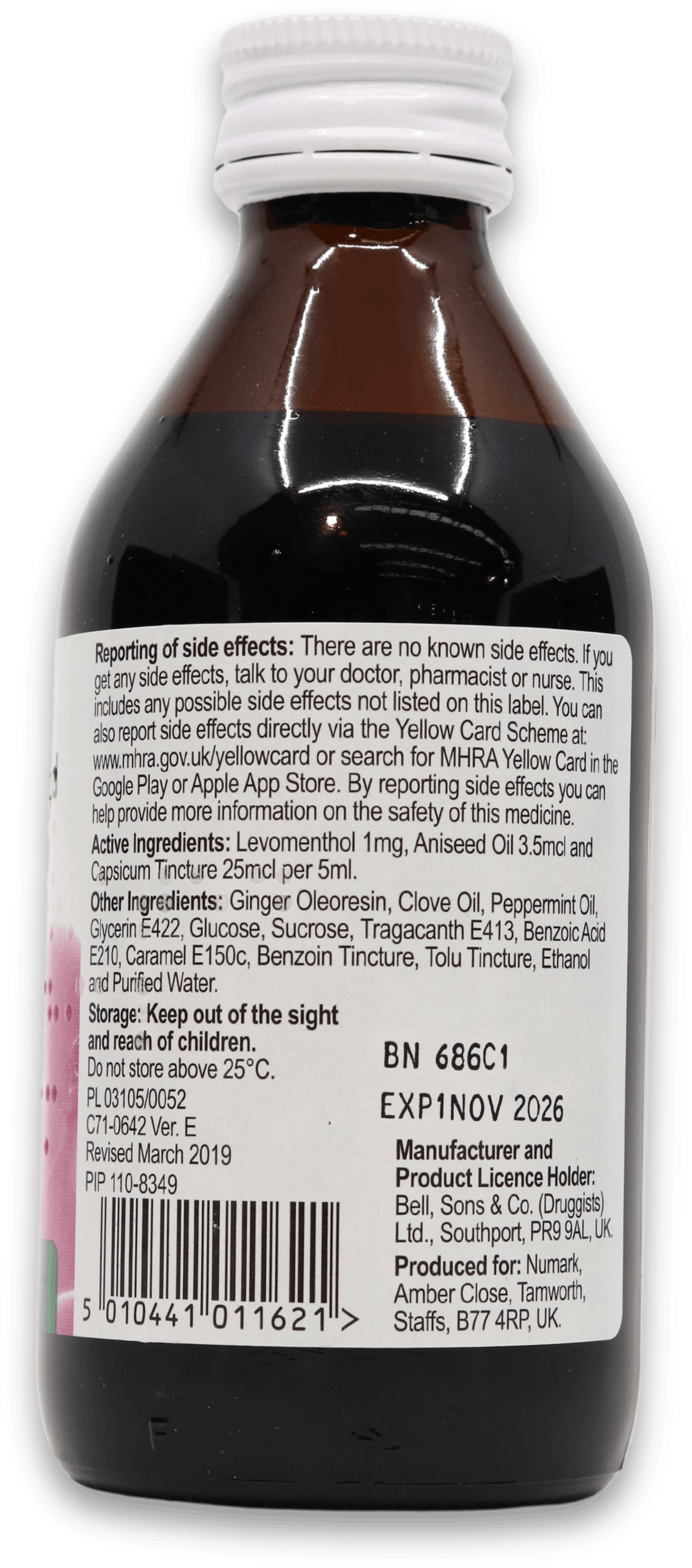 Menthol 1mg, Aniseed Oil 3.5mcl and Capsicum Tincture 25mcl per 5ml, Ginger Oleoresin, Clove Oil, Peppermint Oil, Glycerin E422, Glucose, Sucrose, Tragacanth E413, Benzoic Acid E210, Caramel E150c, Benzoin Tincture, Tolu Tincture, Ethanol, Purified Water