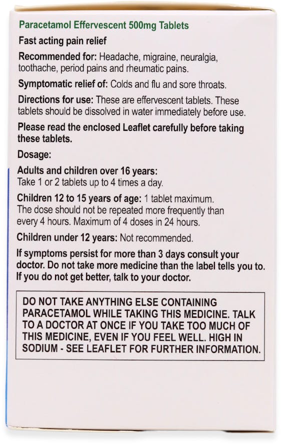 Paracetamol 500mg Effervescent Tablets are analgesic tablets for the relief of mild to moderate pain including neuralgia, migraine, headache, toothache, sore throat, feverishness, period pain and aches and pains such as muscle pain and backache.