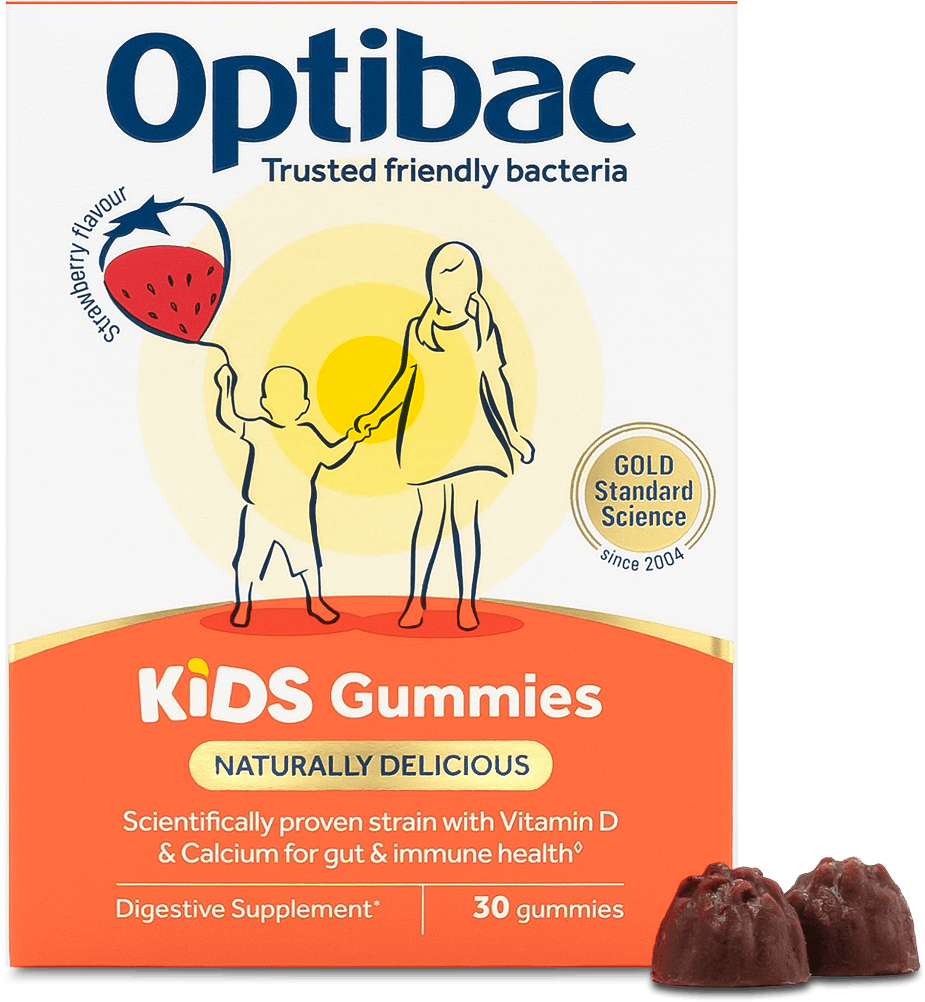 Each delicious strawberry flavour gummy contains 2 billion live cultures + 0.55g (550mg), Fructooligosaccharide (FOS) fibres, guaranteed until the date of expiry, plus vitamin D3 to maintain immune health and calcium to support the normal function of digestive enzymes. Calcium and Vitamin D3 are needed for normal growth and the development of bone in children.