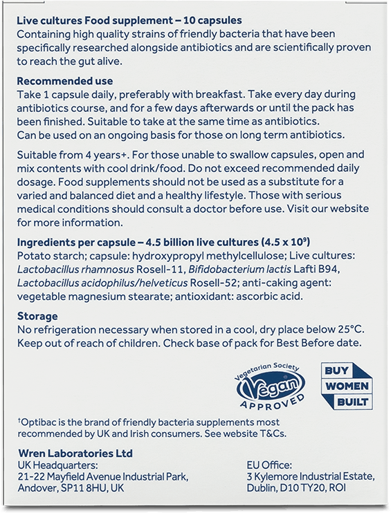 Can be taken at the same time as antibiotics - this product has been clinically trialled alongside antibiotics and found to reach the gut alive.
