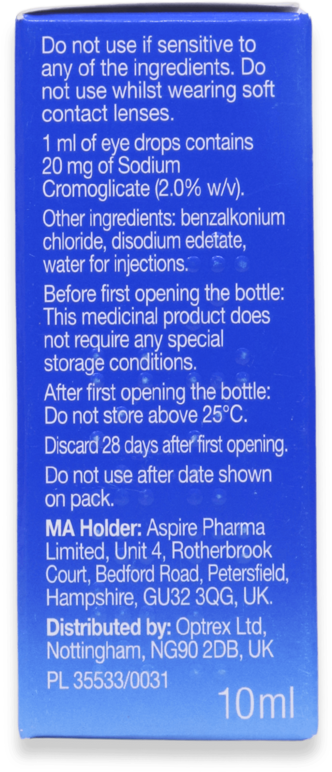 1 ml of eye drops contains 20 mg of Sodium Cromoglicate (2.0% w/v)