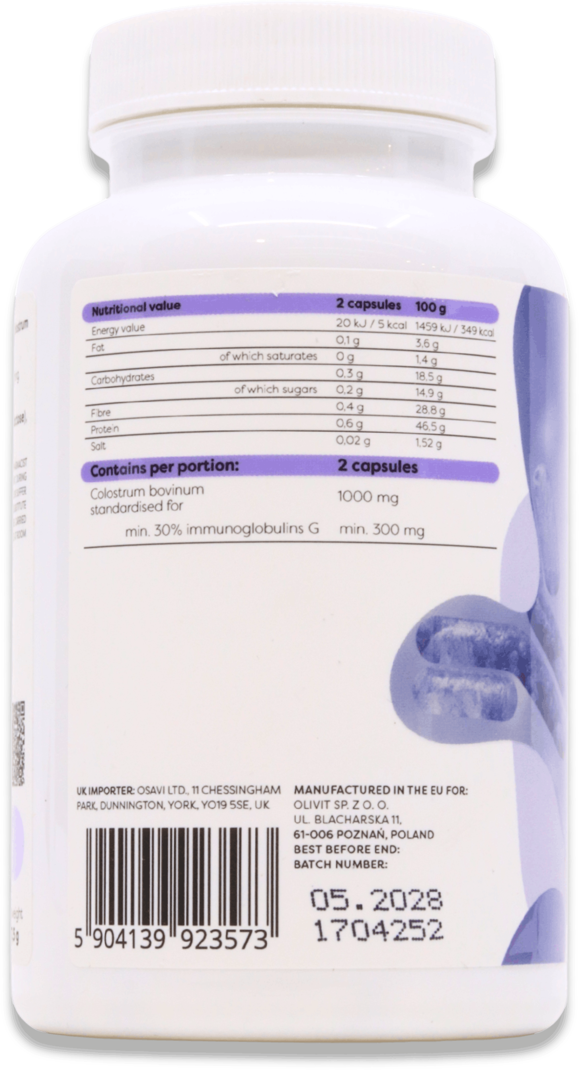 - Contains bovine colostrum sourced from Holstein-Friesian cows in Poland, harvested within 12 hours after calving to ensure high levels of IgG (often above 18% or up to 30% depending on the batch)