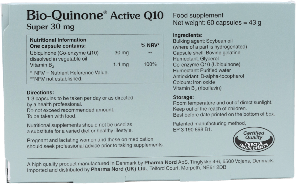 Pharma Nord Bio-Quinone Active Q10 30mg 60 Capsules supports daily energy needs, ideal for adults combating tiredness or low energy. It features coenzyme Q10 as ubiquinone, combined with vitamin B2 to aid energy metabolism and decrease fatigue. With over two decades of research, this formula ensures reliable absorption and consistent outcomes.