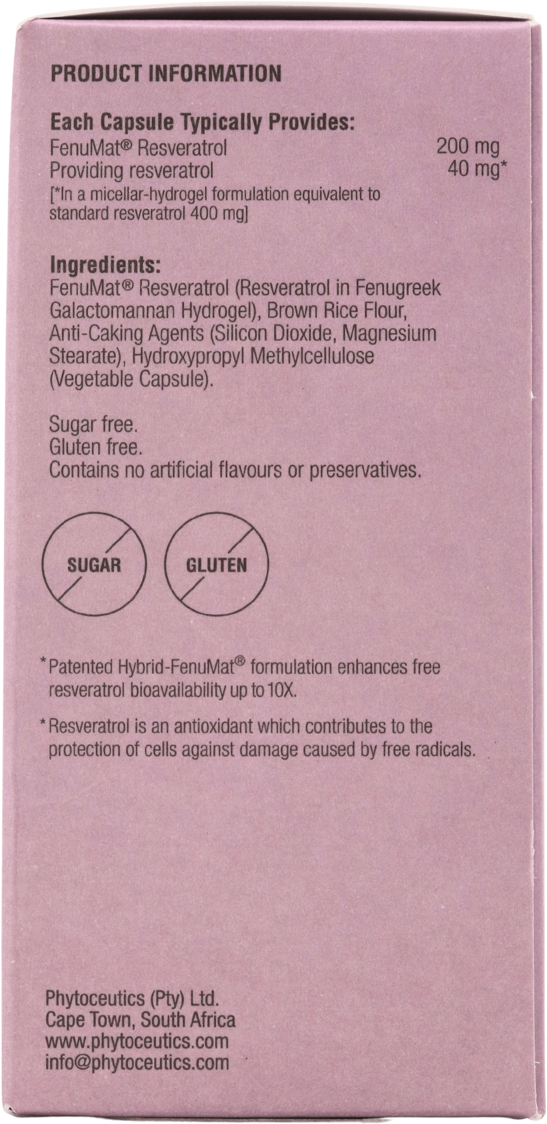 - Enhanced bioavailability: Uses ResveraFen and Hybrid-FENUMAT technology to improve resveratrol solubility and absorption compared with conventional forms, supporting effective antioxidant activity at a lower daily dose.