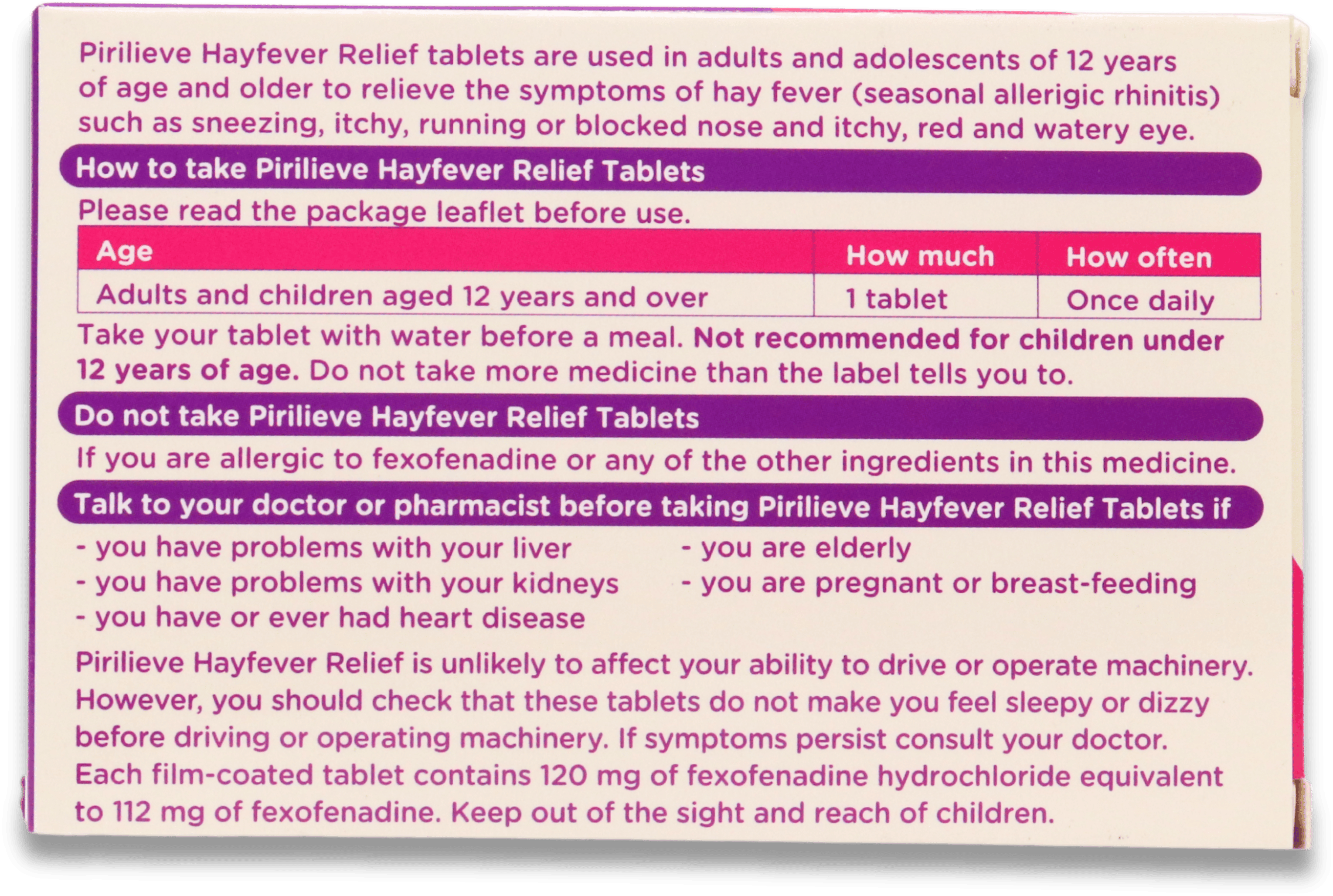 Pirilieve Hayfever Relief blocks histamine, a substance in the body responsible for allergic symptoms. Its active ingredient, fexofenadine hydrochloride, targets this process to reduce reactions without causing tiredness in most people.