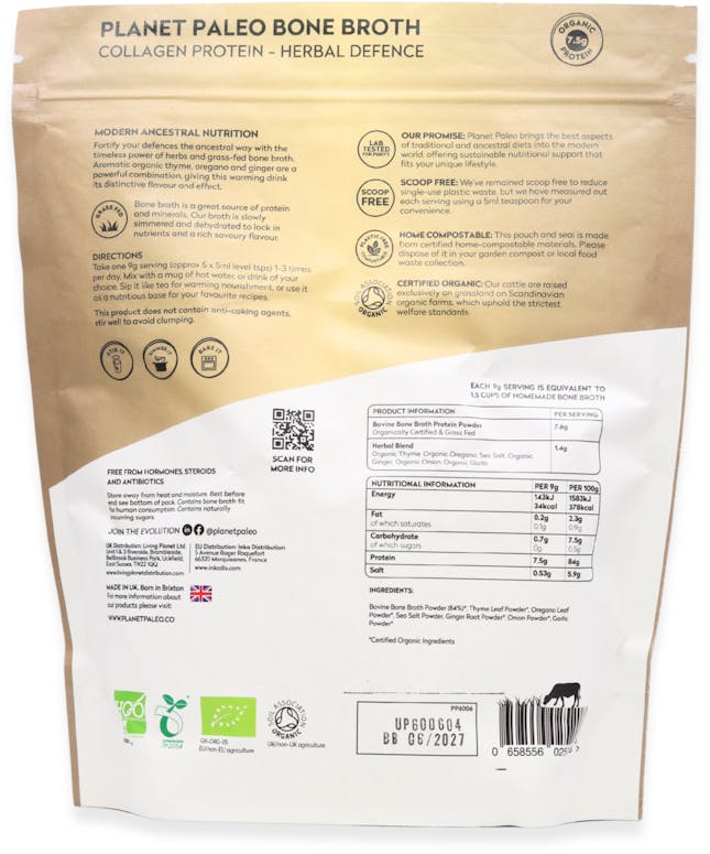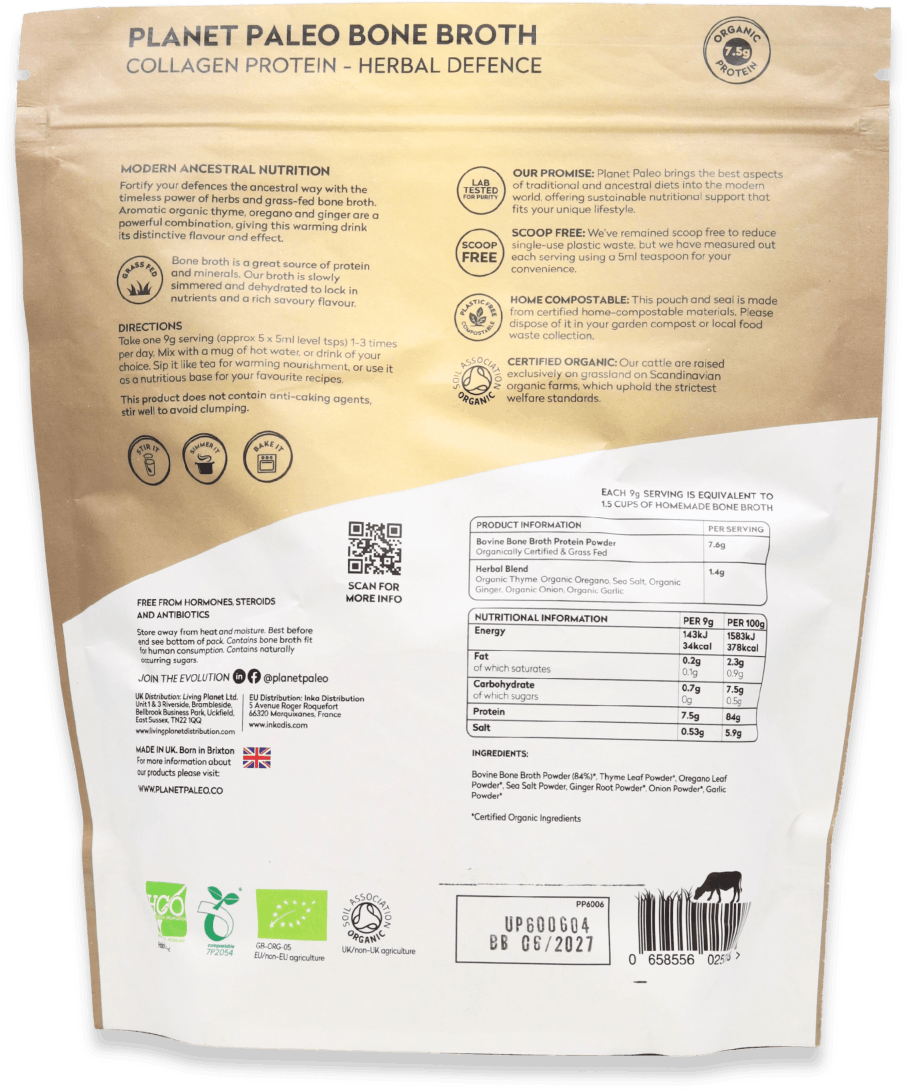 - Planet Paleo Organic Bone Broth Collagen Protein Herbal Defence 450gm, an ideal size for the family's needs