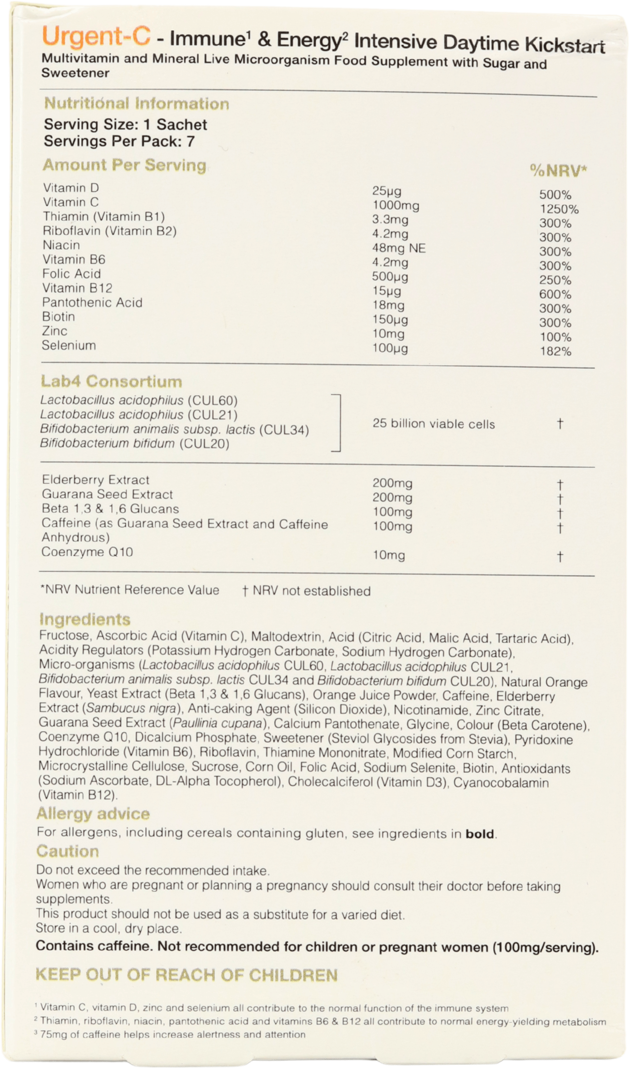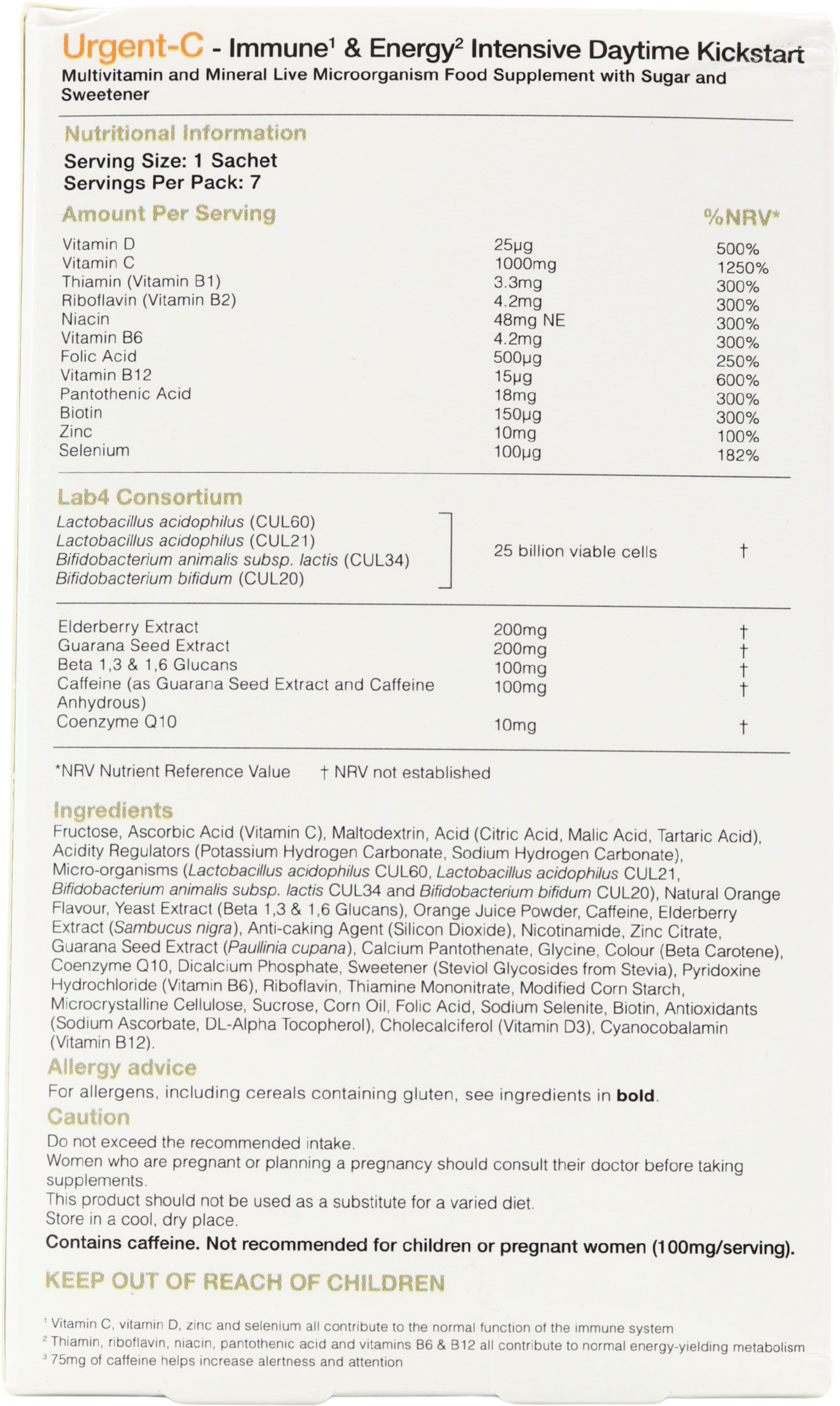 ProVen Probiotics Urgent-C Immune & Energy Intensive (Daytime) is a comprehensive supplement designed to enhance overall wellbeing. This carefully formulated product combines Lab4 friendly bacteria with essential nutrients, supporting both immune health and energy levels. Each sachet delivers 25 billion live bacteria alongside a potent blend of vitamins and minerals, making it ideal for individuals looking to boost their daily wellness. Perfect for busy professionals, athletes, or anyone seeking enhanced vitality.