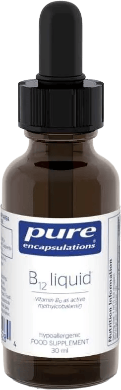 Pure Encapsulations B12 Liquid 30ml is a dietary supplement that delivers methylcobalamin, the active form of vitamin B12, in a user-friendly liquid format. This supplement is ideal for individuals looking to enhance their daily energy levels and support neurological health, particularly vegetarians or those with hectic lifestyles. Many opt for Pure Encapsulations B12 Liquid due to its contributions to red blood cell function, energy metabolism, and nerve cell health, all presented in a pleasant-tasting, easy-to-use form. The formula is crafted with natural ingredients such as purified water, apple juice concentrate, and vegetable glycerin, and is certified gluten-free, non-GMO, and hypoallergenic.