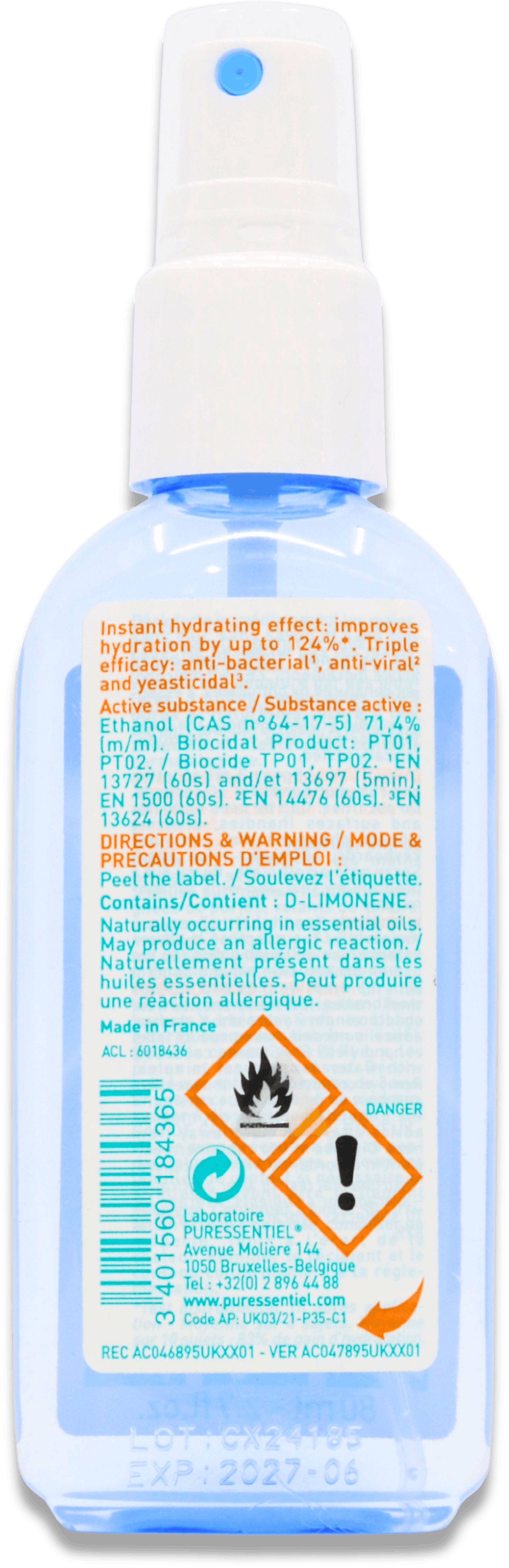 Puressentiel Antibacterial Lotion Spray 80ml swiftly cleans hands and surfaces, ideal for those on the go. It effectively eliminates 99.9% of bacteria and viruses, offering a sense of security. The formula is crafted with 71.9% plant alcohol, three essential oils, and aloe vera for gentle, moisturised skin.