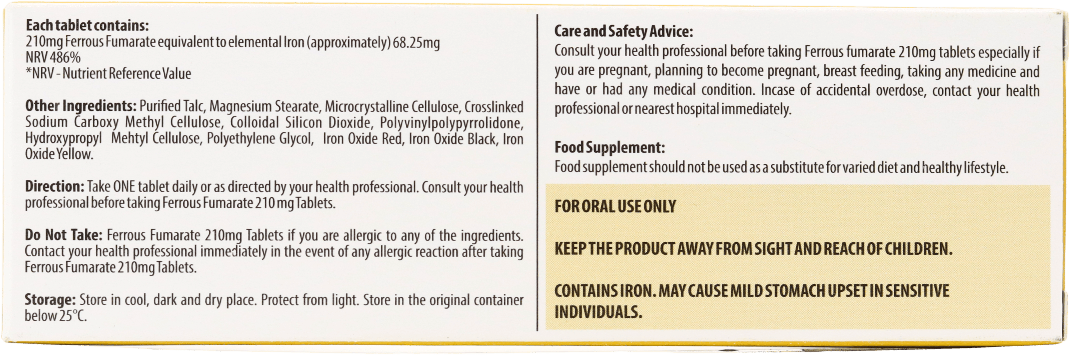 - Ferrous fumarate 210 mg per tablet (equivalent to approximately 68.25 mg elemental iron)