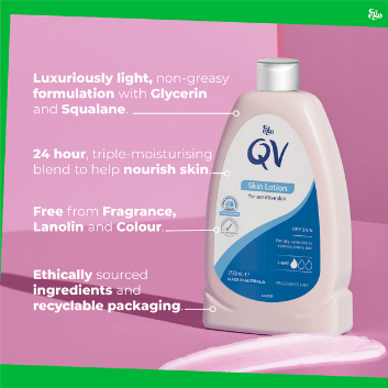 QV Skin Lotion for Dry Skin Conditions is a lightweight, non-greasy moisturising lotion designed to provide intense hydration for all skin types, including sensitive and dry skin. Treat and relieve symptoms of dry skin conditions, such as psoriasis, eczema, dermatitis, xerosis or ichthyosis – and with 24-hour moisturisation, you'll feel soft and smooth all day.