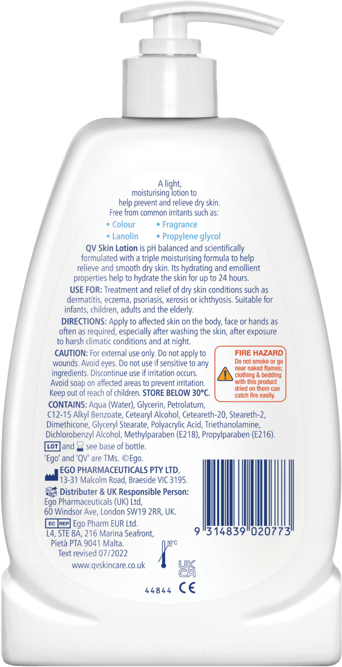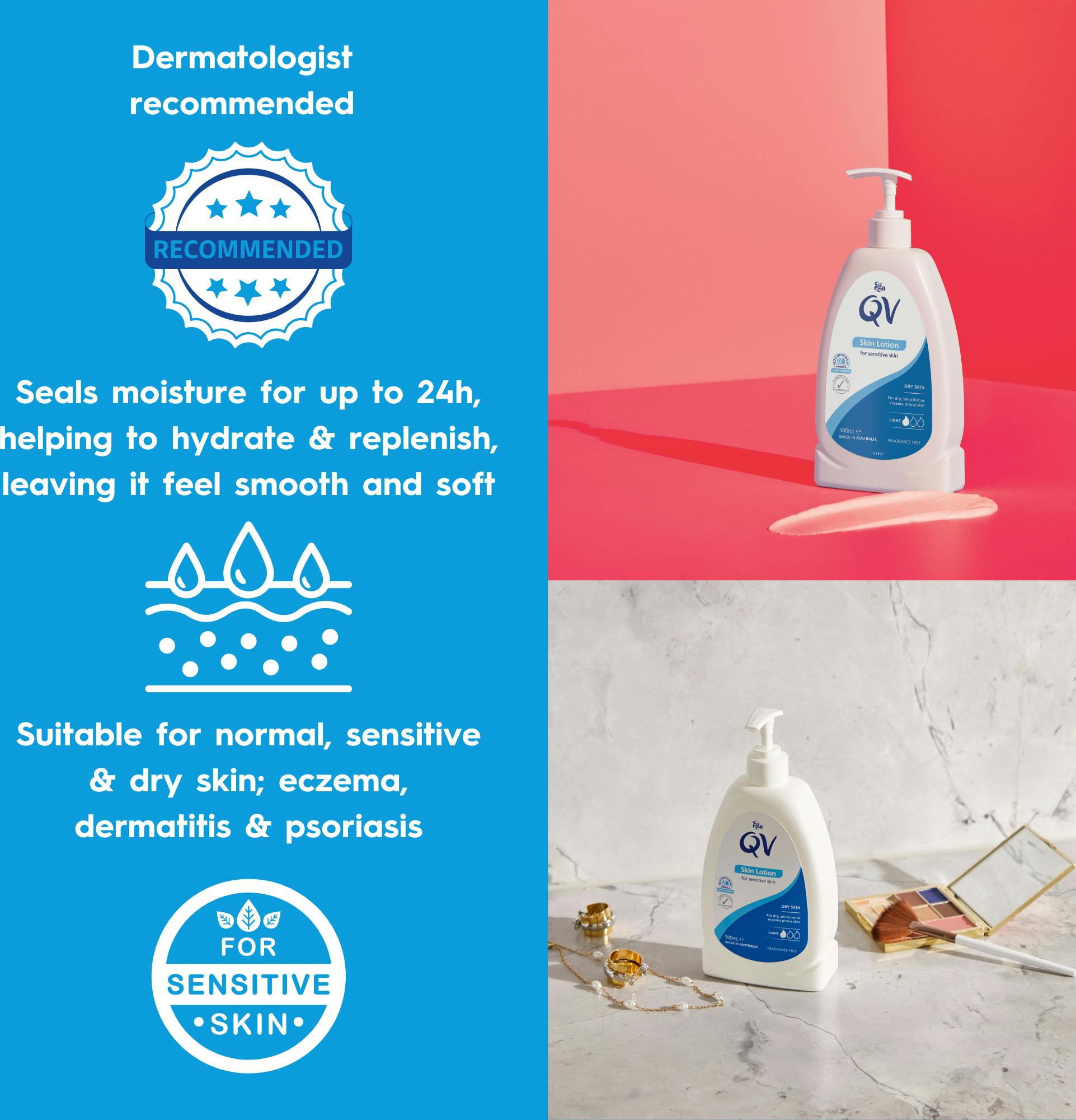 QV Skin Lotion for Dry Skin Conditions is a lightweight, non-greasy moisturising lotion designed to provide intense hydration for all skin types, including sensitive and dry skin. Treat and relieve symptoms of dry skin conditions, such as psoriasis, eczema, dermatitis, xerosis or ichthyosis – and with 24-hour moisturisation, you'll feel soft and smooth all day.