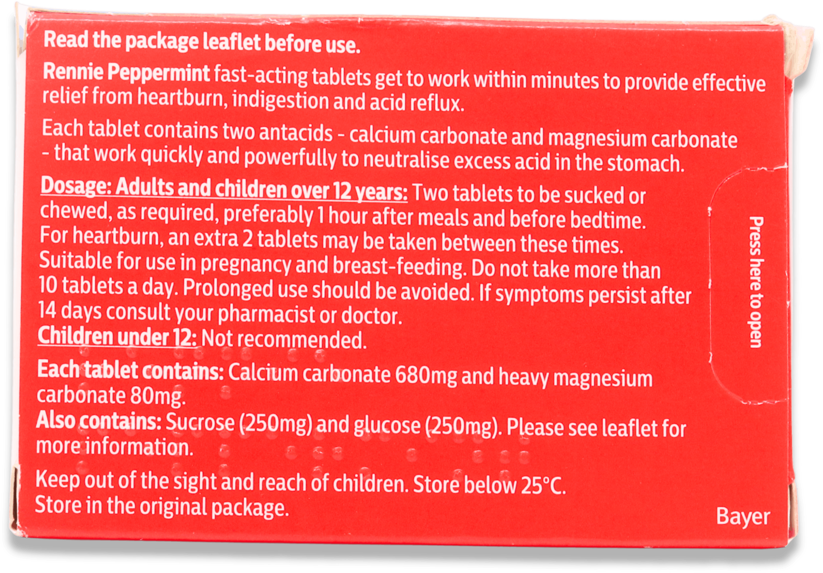 Rennie Peppermint is crafted to address heartburn, indigestion, hyperacidity, flatulence, upset stomach, and dyspepsia.
