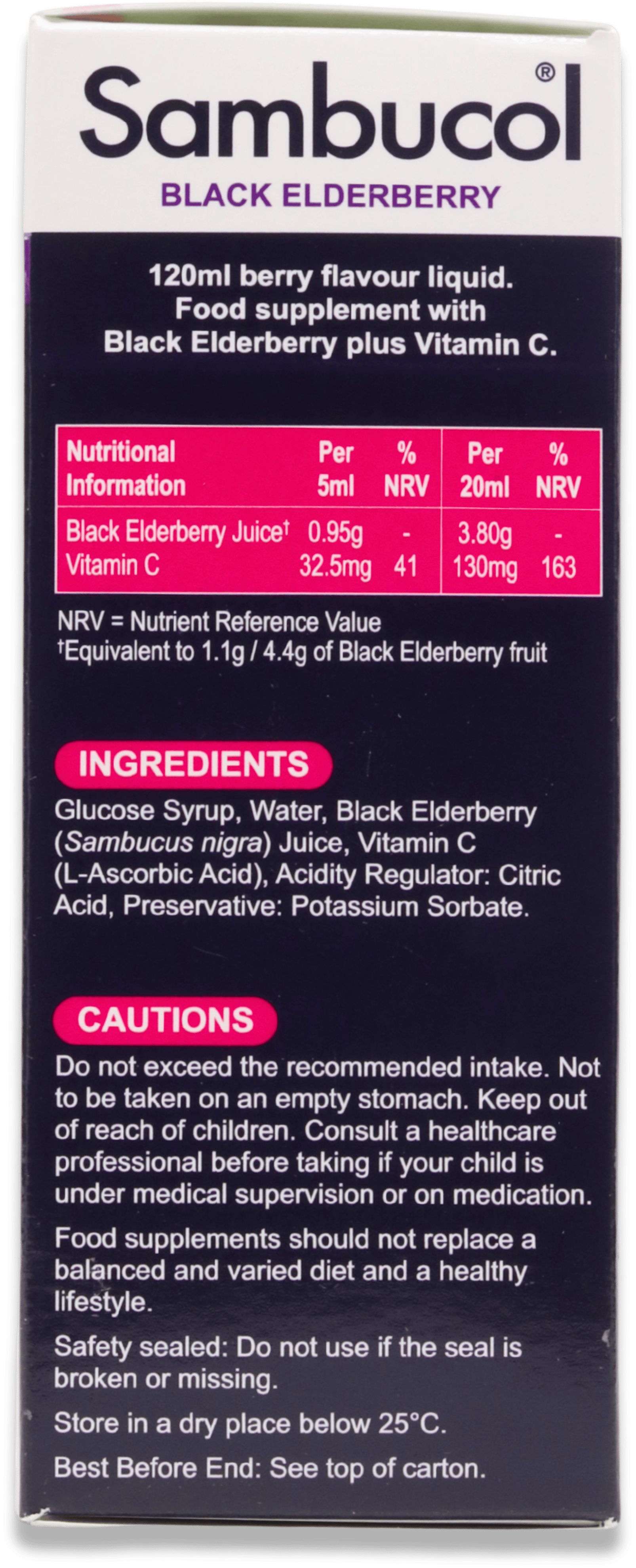 Glucose Syrup, Black Elderberry Juice (Sambucus nigra), Vitamin C (Ascorbic Acid), Acidity Regulator: Citric Acid, Preservative: Potassium Sorbate.