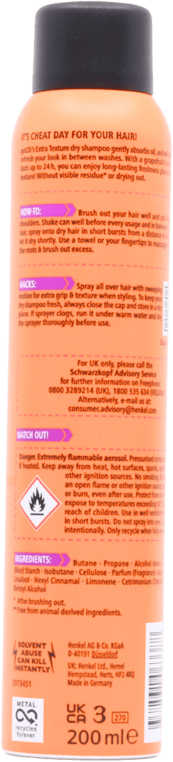 Apply on dry hair, hold can 20cm away from head, section hair & spray into roots. Use in short bursts. Using your fingertips, massage your head thoroughly to distribute & then brush.